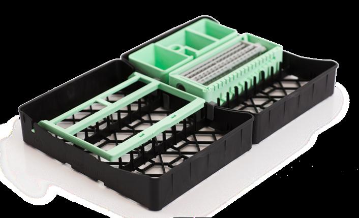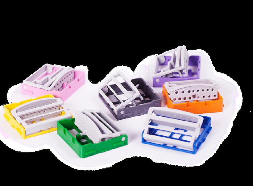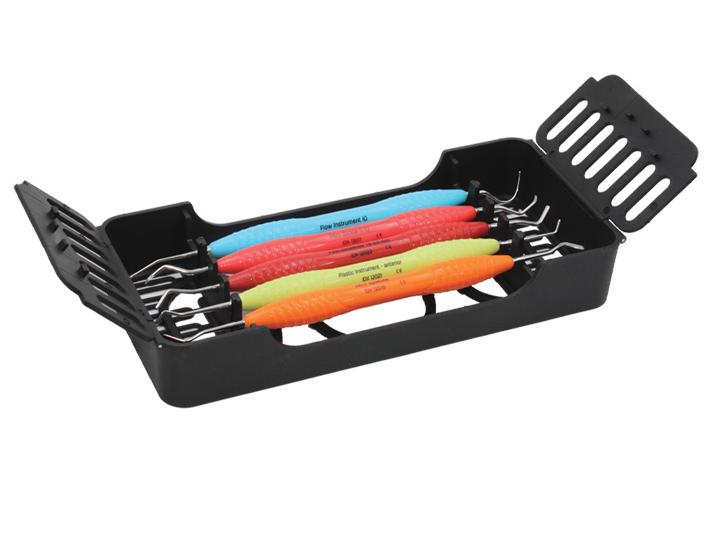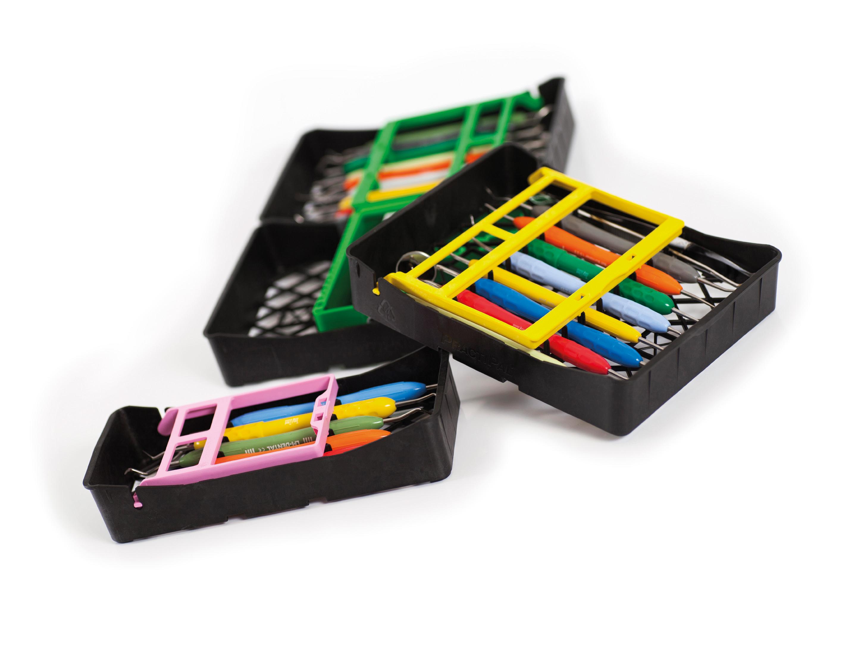 Mange kombinasjonsmuligheter gir klinikken mulighet til å lage ferdige oppsatte brett for hver behandlingsform. Man unngår at instrumentene ligger og slår mot hverandre i en instrumentkurv, noe som gir økt holdbarhet på instrumenter og minimerer faren for stikkskader. Bøyle, bor og filholder settes enkelt fast på brettet og holder dermed alt på plass under hele rengjøringsprosessen. Lette å åpne. De åpne brettene tillater høy vann/damp gjennomstrømning, og gir en forbedret rengjøringseffekt. Glassfiberforsterkede lette plastbrett – absorberer minimal varme i desinfektor og autoklav. Bøylen og fil-/bor-/ tilbehørholder finnes i 9 farger, for enkel fargekoding/ organisering. Alle delene kan kjøpes separat.