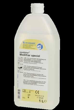 Flytende avspenningsmiddel – samme bruksområde og samme virkning. Skyllemiddel, flytende konsentrat. Rask og flekkfri tørking av dentalinstrumenter. Med korrosjonsbeskyttelse. Mielclear og Mediklar har samme dosering, så det er ikke behov for justering på maskin eller pumple. 887171 1 liter 282,-
