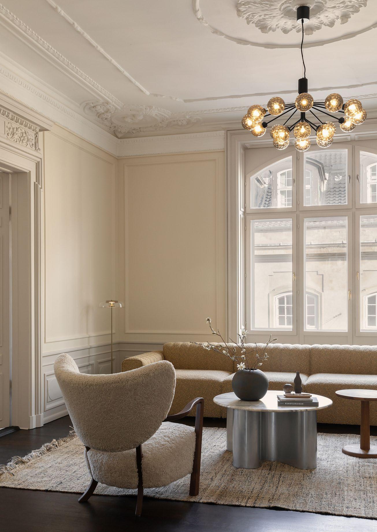 Her vil en lysekrone sænke loftet visuelt og samtidig give et mere intimt rum omkring spise bordet.
