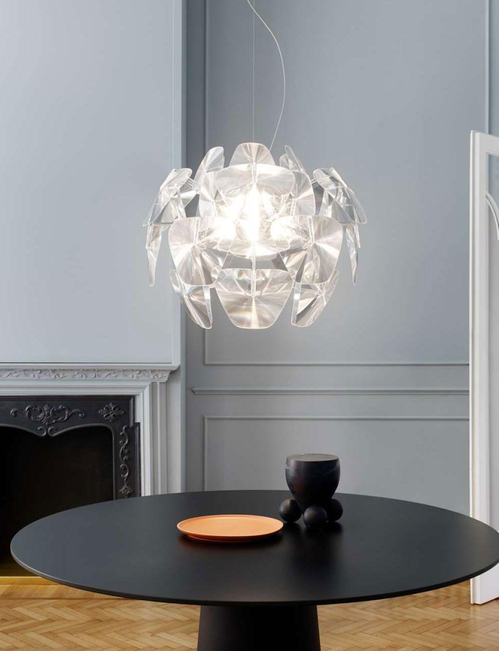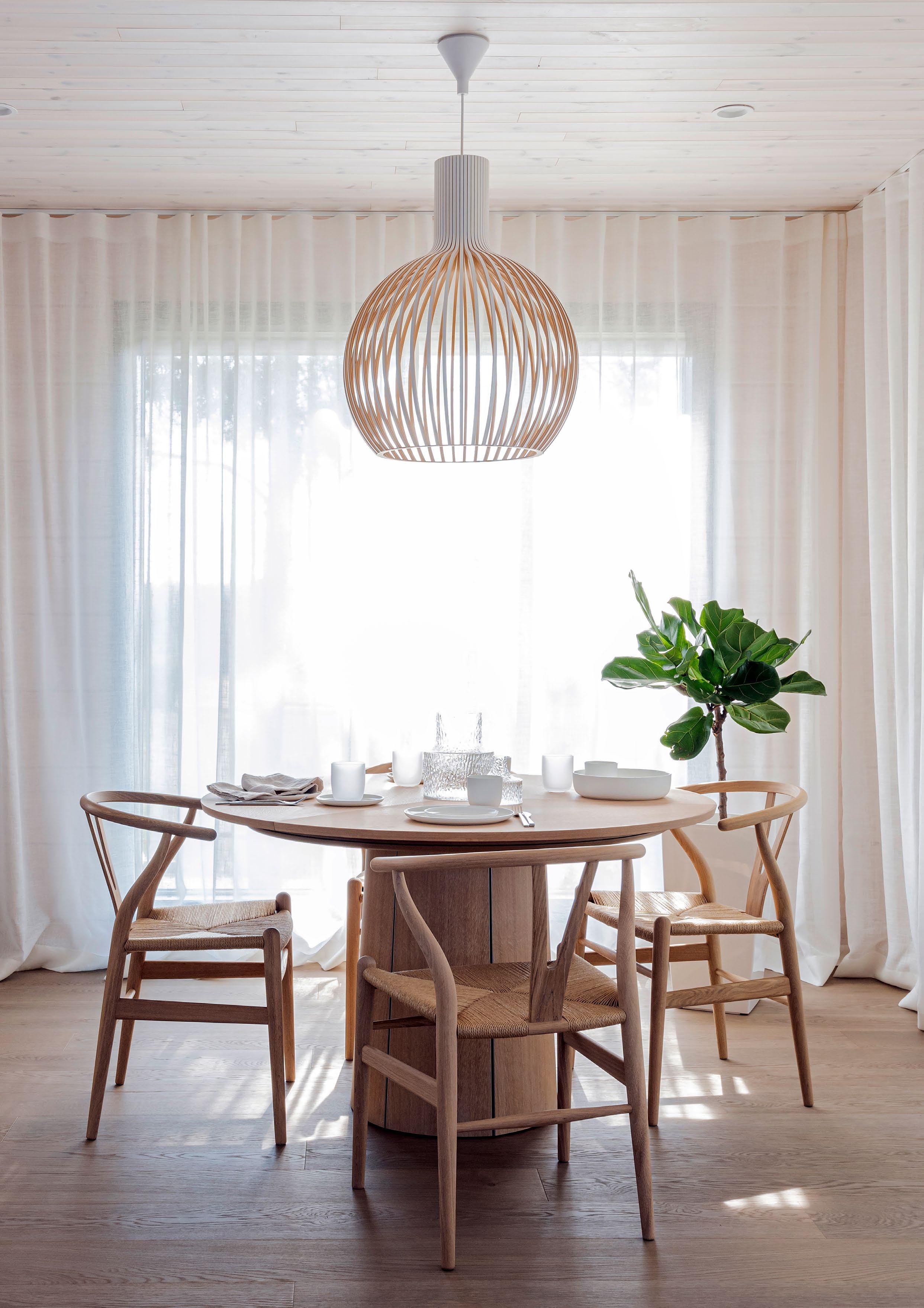 Er der højt til loftet? Her vil en oversize pendel sænke loftet visuelt og samtidig give et mere intimt rum omkring spisebordet.