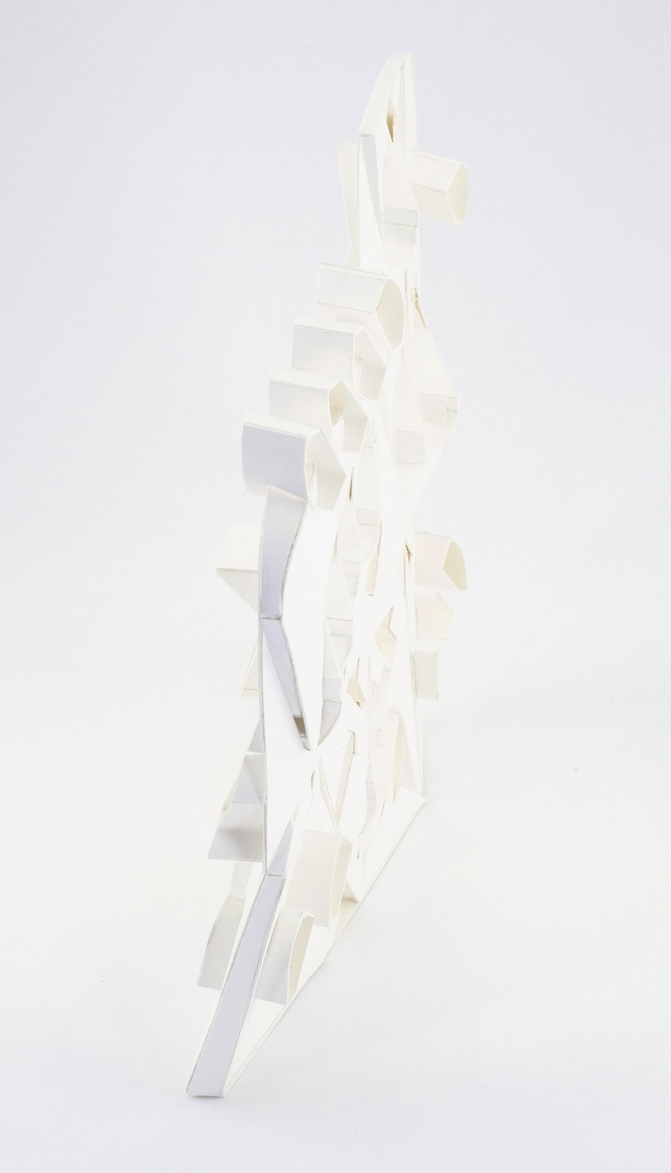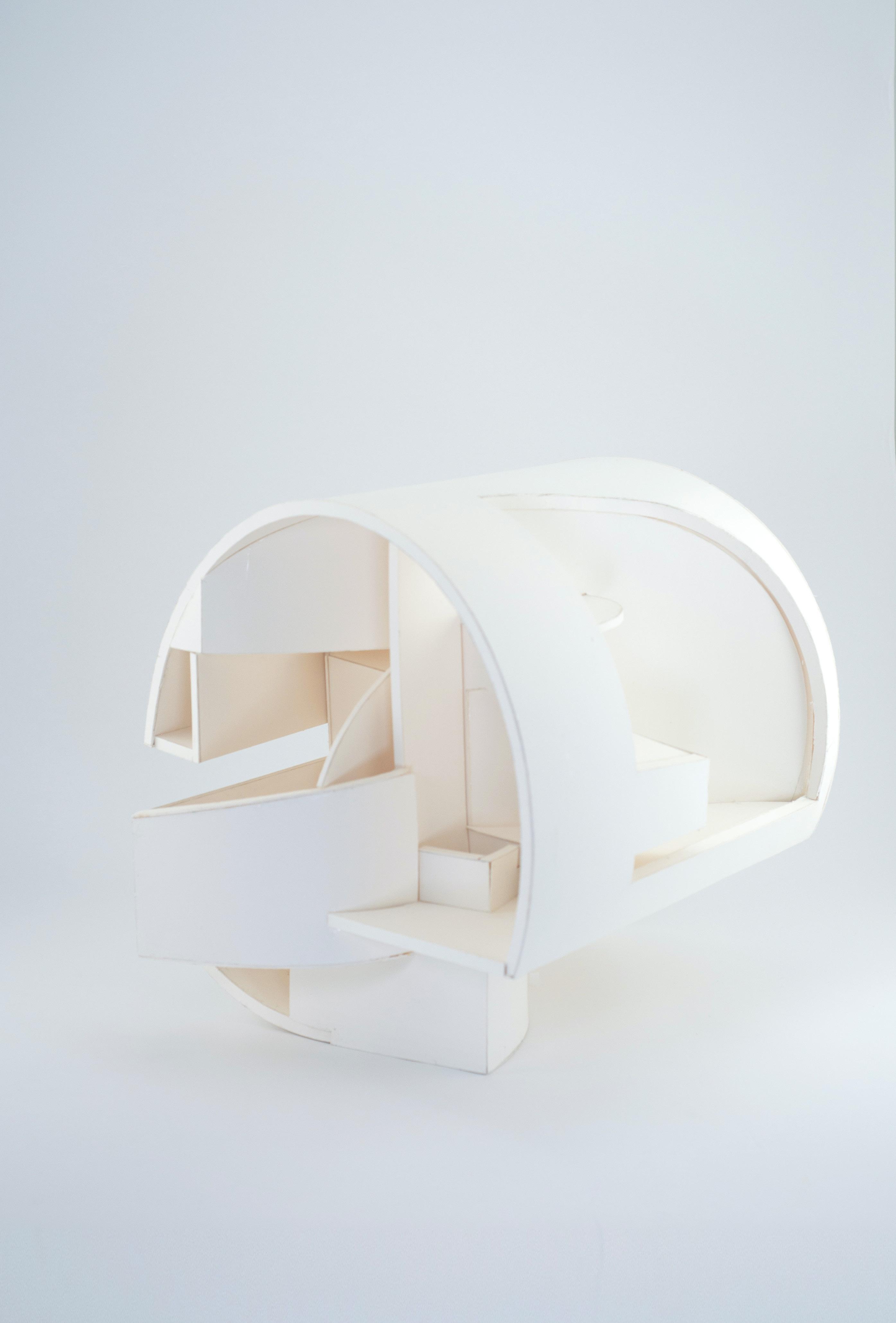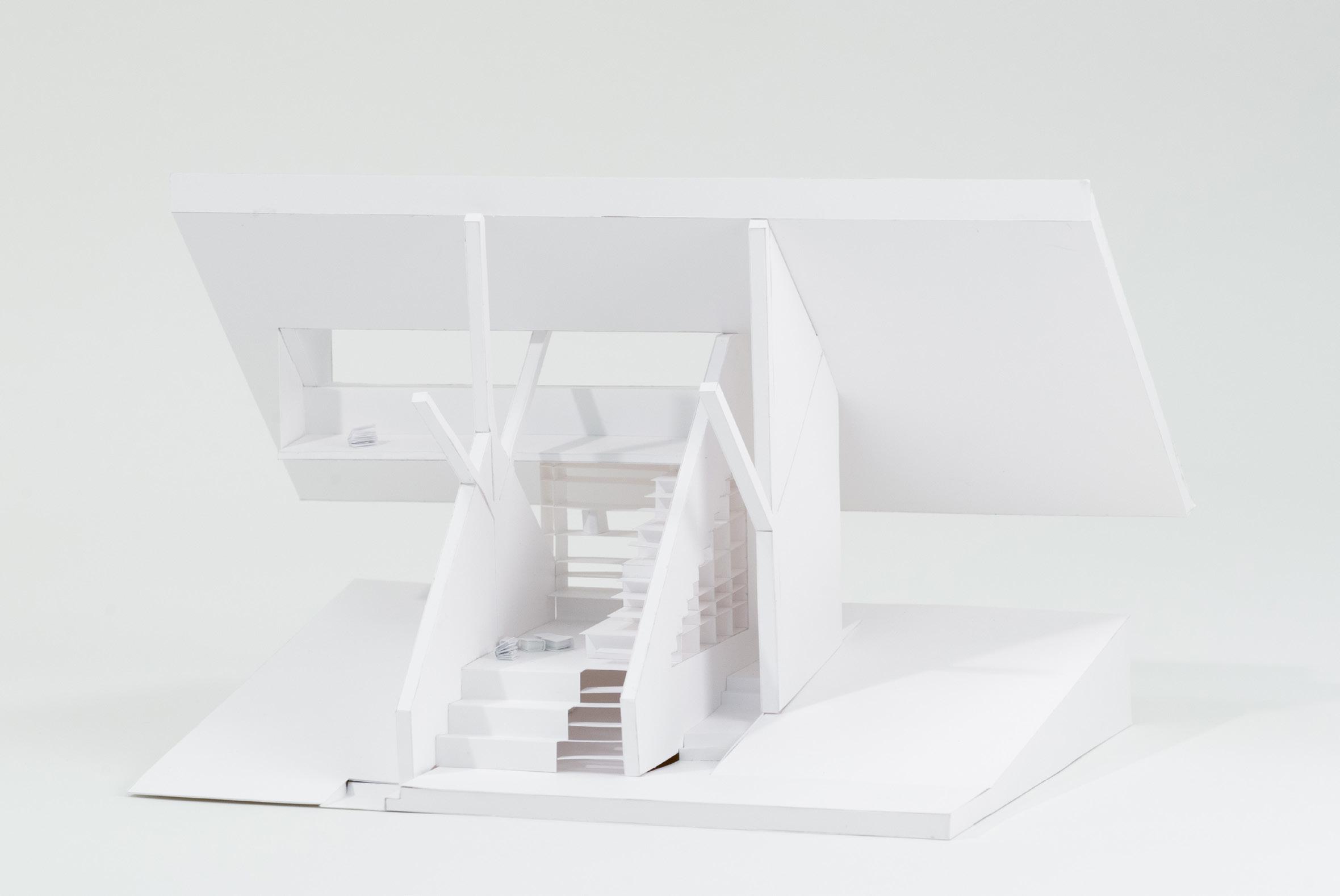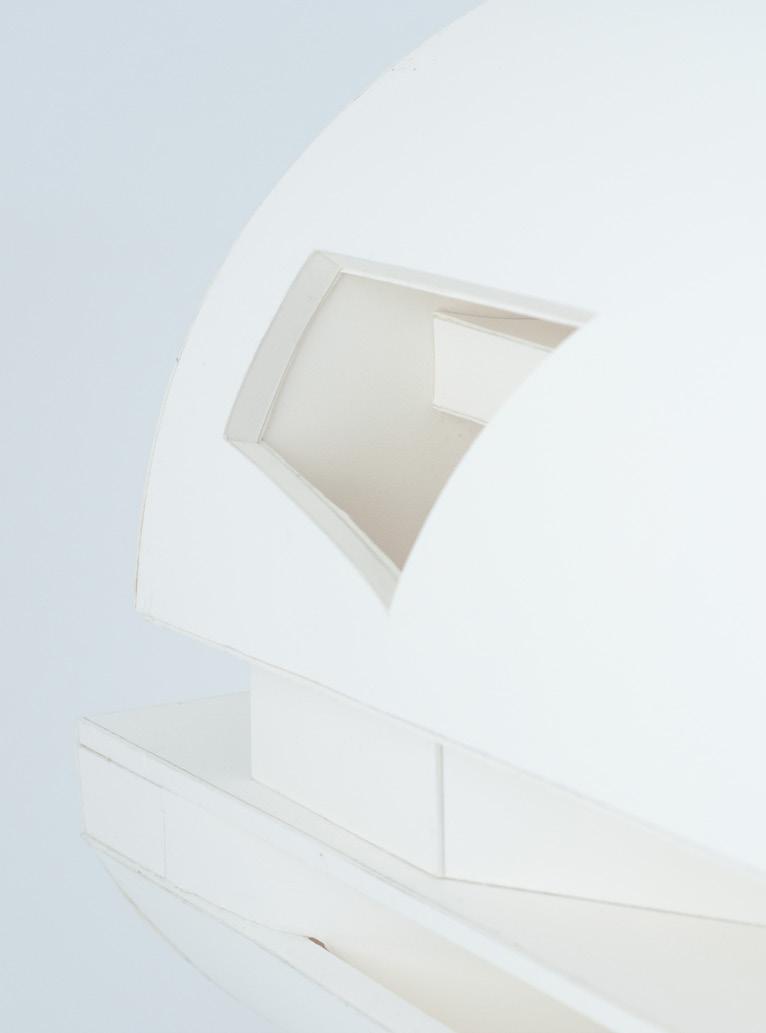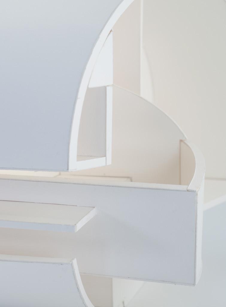 The model can be read as one open space. Depending on where it is, volumes can be read differently due to condensing and expanding shells. The inside and outside are pushed and pulled out of its bounds. This create moments where space slips out, cuts through and almost touches the shell.