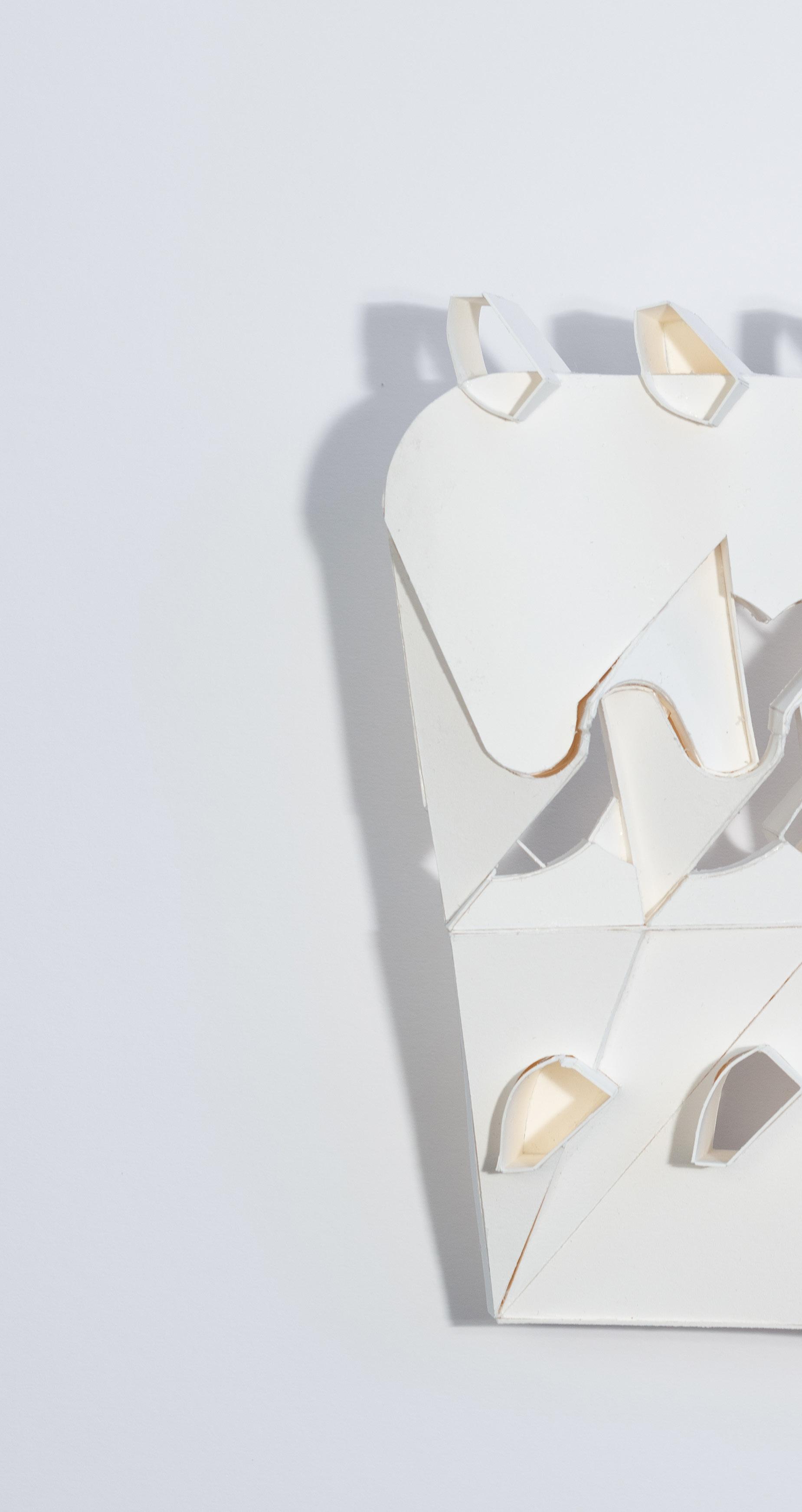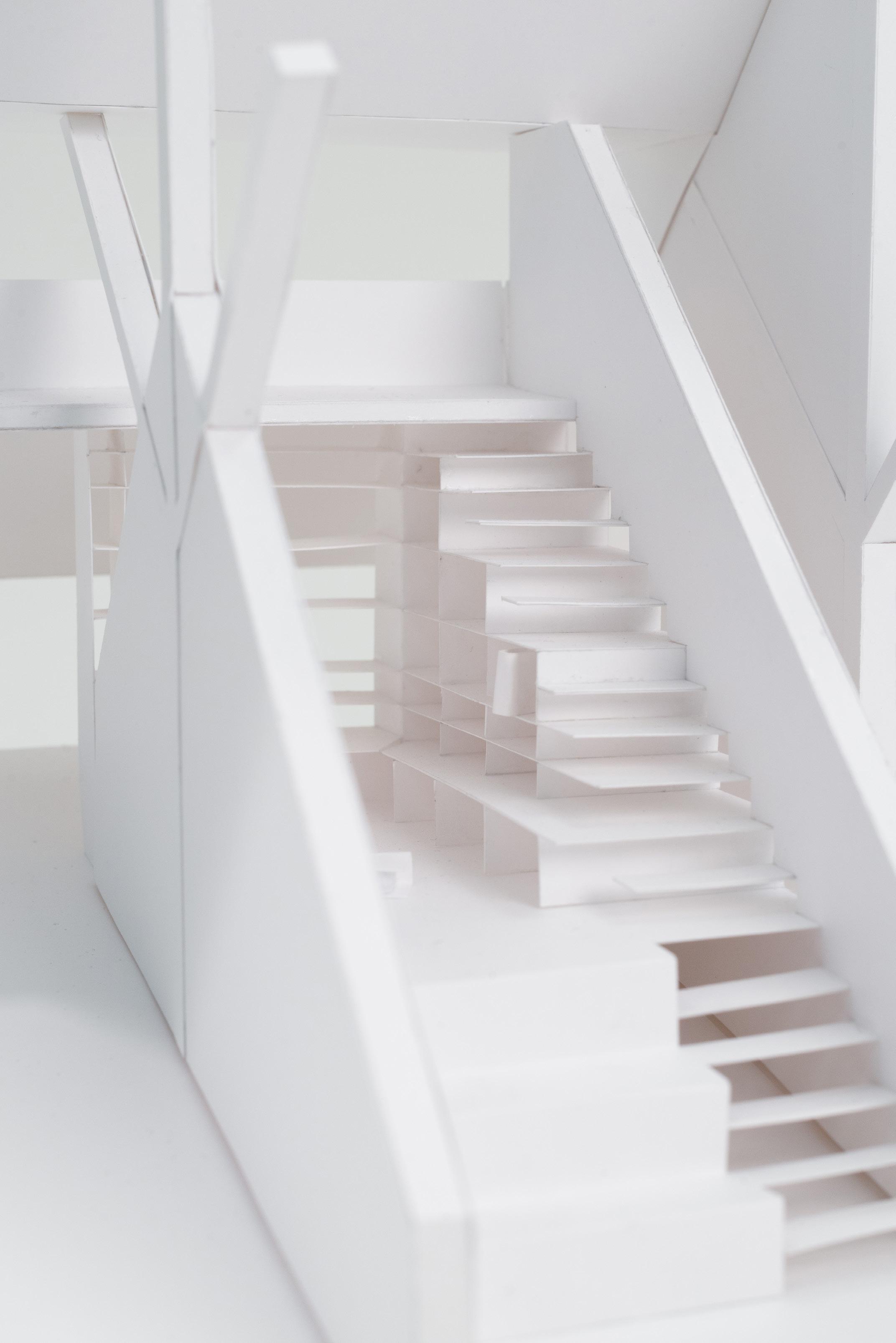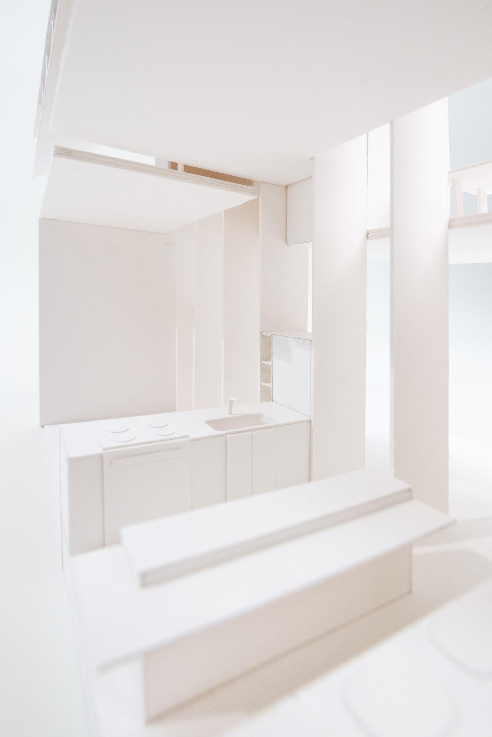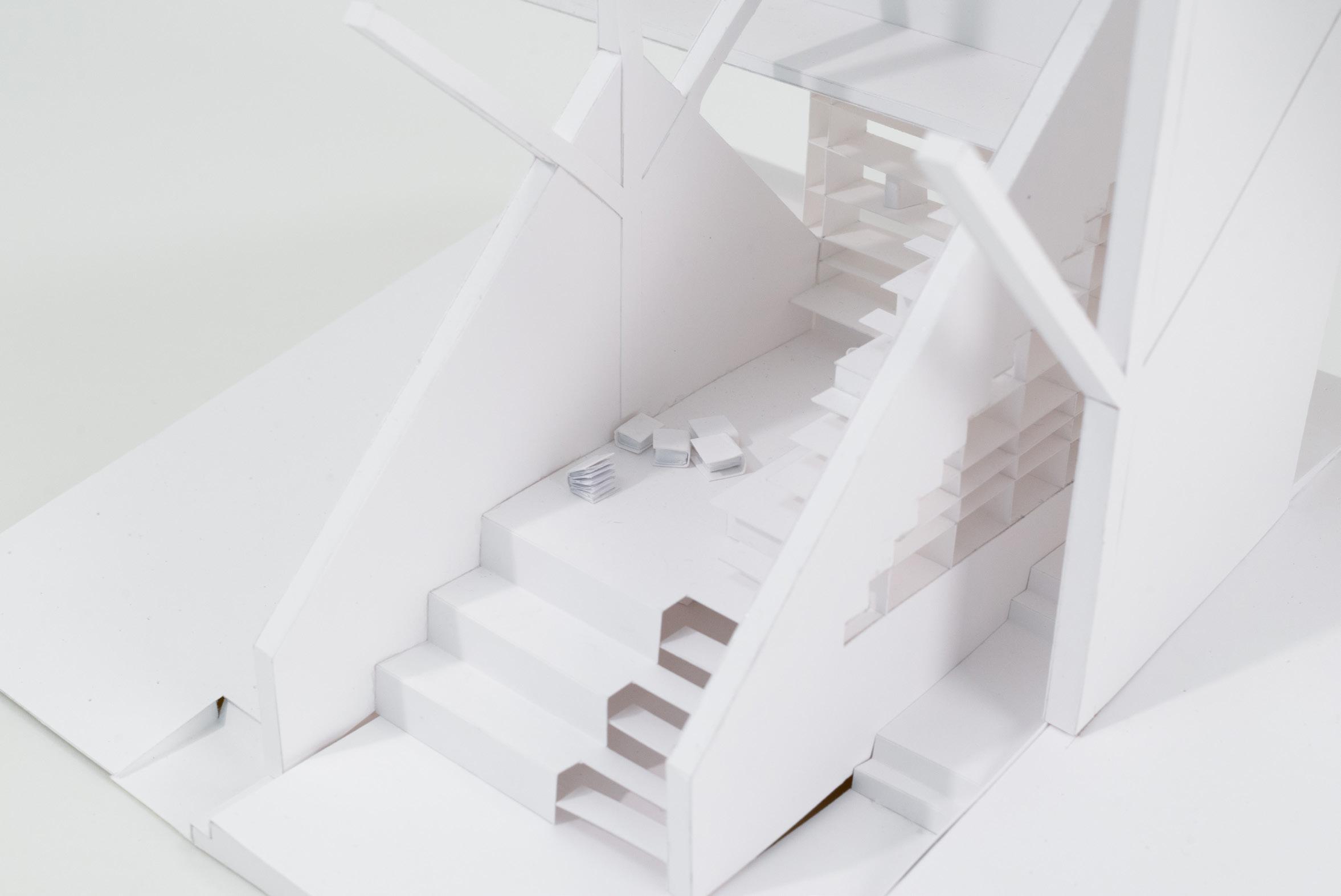 The model can be read as one open space. Depending on where it is, volumes can be read differently due to condensing and expanding shells. The inside and outside are pushed and pulled out of its bounds. This create moments where space slips out, cuts through and almost touches the shell.