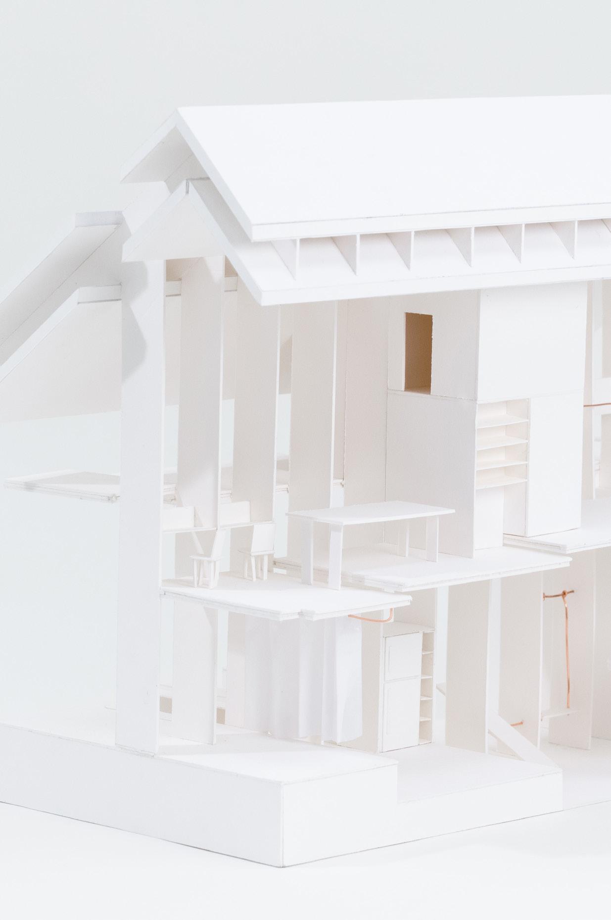 This model focuses on illusive space that has deceptive volumes. Like Tanikawa, there is no clear inside or outside. For Tanikawa, it is a shell that houses both inside and outside. The roof is not one to one with the space it is covering. The layers of shell have complex relationship with what’s inside, outside or between the shells.