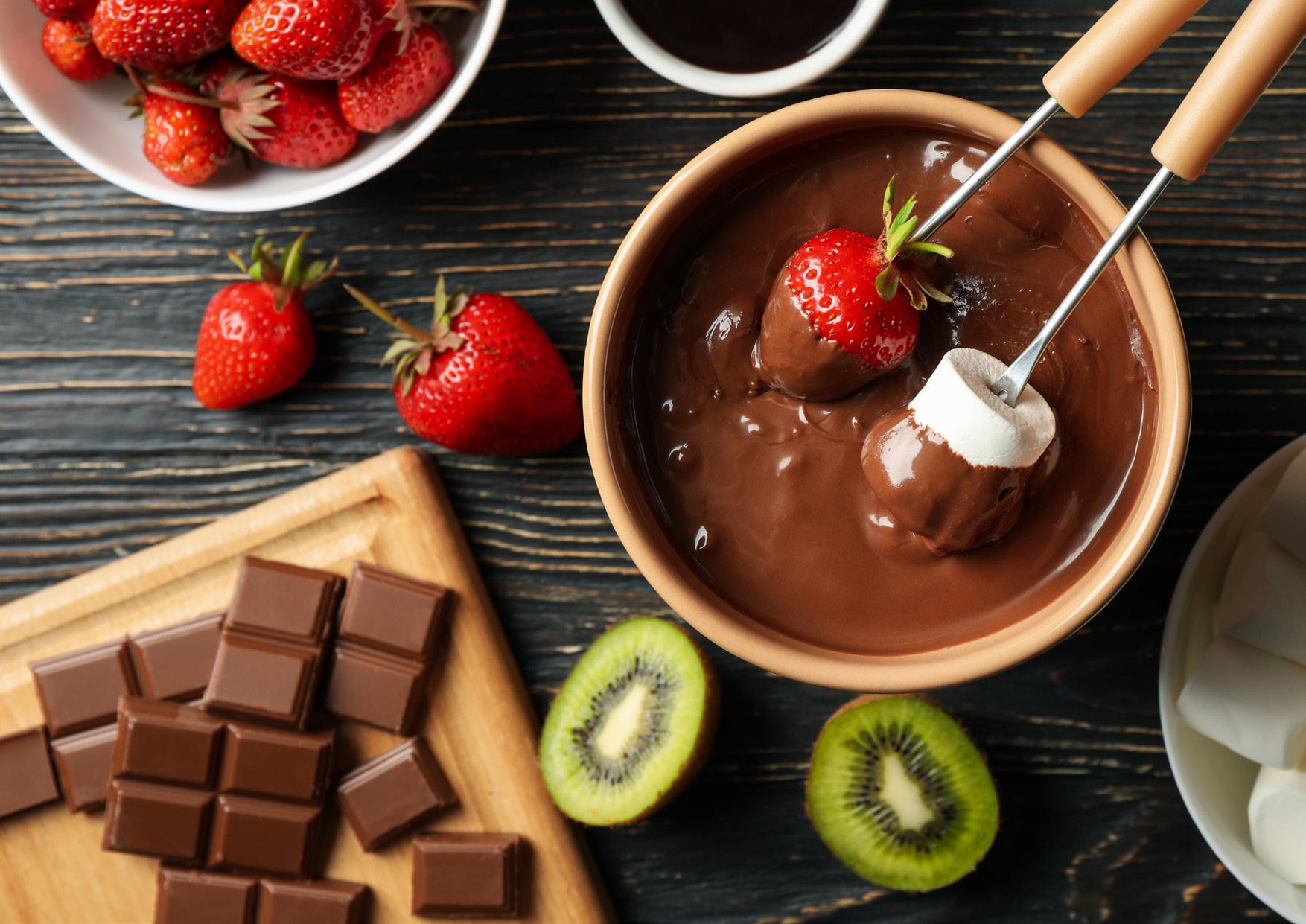 Em uma panela própria para fondue, coloque o creme de leite para aquecer. Adicione o chocolate ralado e mexa até derreter por completo e formar uma mistura homogênea. Deixe a chama baixa do aparelho de fondue e mergulhe com o garfo próprio um pedaço picado da fruta escolhida.