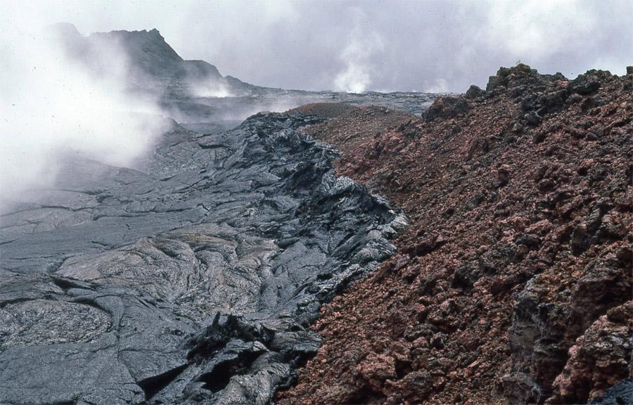 Pahoehoe is hot, more liquid, and flows more freely over the ground. It cools into a smooth, more ropy surface, something like cake batter. It is much easier to walk on than a`a, which is slightly cooler in temperature. It is denser, more sluggish as it advances, and piles up in lumps and clumps that often have very sharp edges. Trails try to avoid a`a whenever possible, but sometimes you have to cross an expanse of it to get to your destination. If you fall on it, you can get a nasty cut. It will shred even sturdy boots in short order, and will consume cheap running shoes in about a week.
