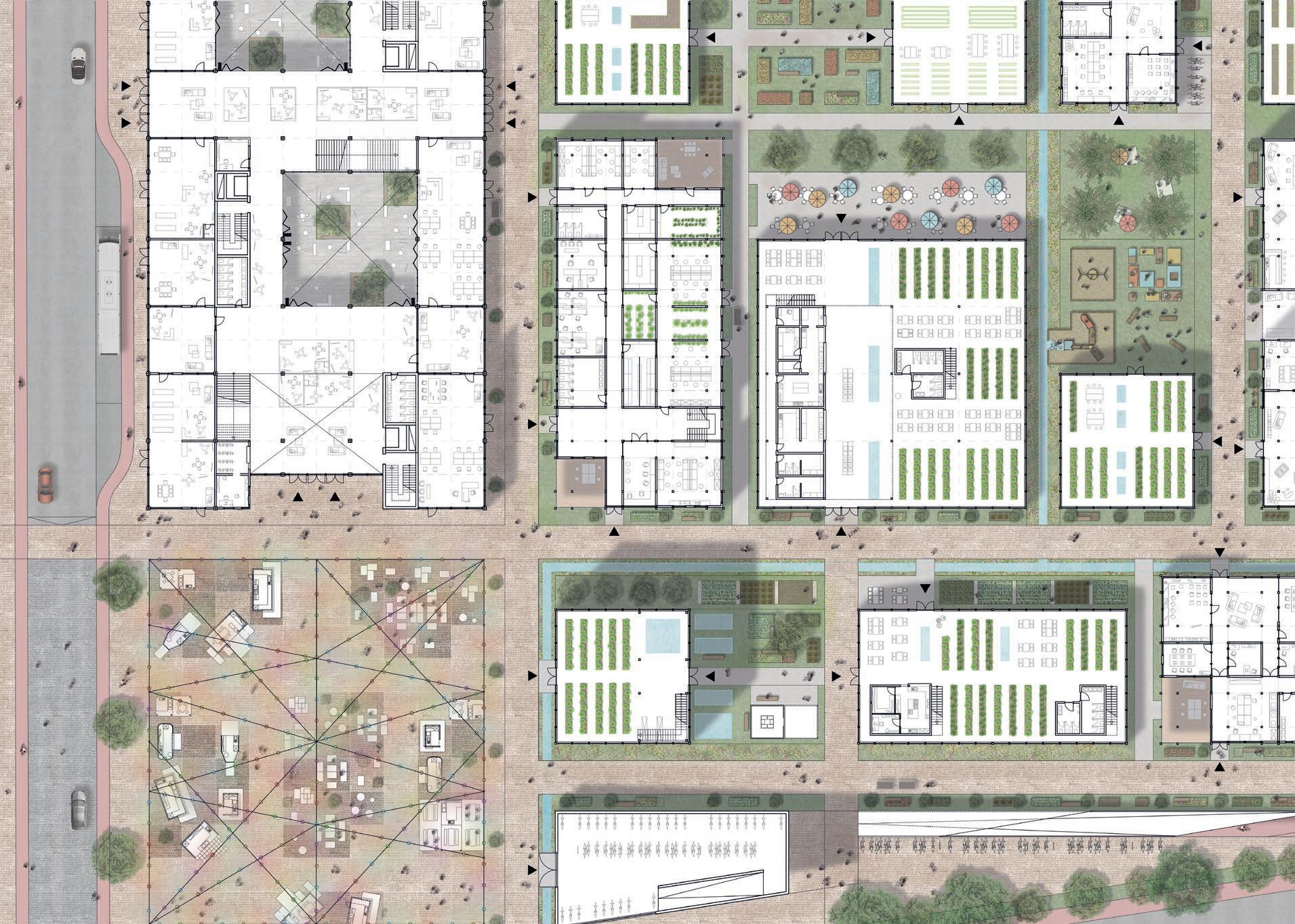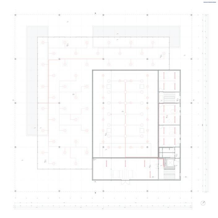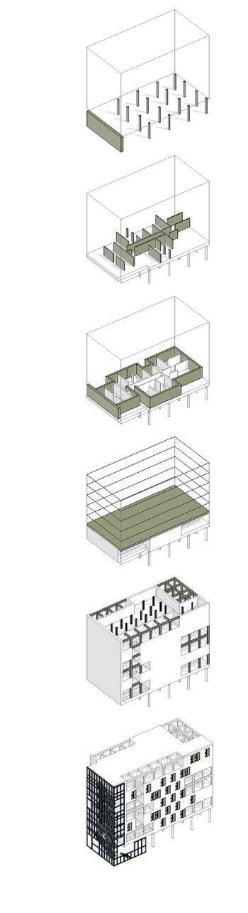Das vorhandene Achsraster wird in der Breite beibehalten und in der Länge erweitert, um eine großzügigere Wohnfläche zu schaffen. Die Wohnungen und Laubengänge sind in einem Mix aus Ost-West-Orientierung angeordnet, um eine optimale Ausnutzung des natürlichen Lichts zu gewährleisten. Das Reuse Konzept zielt darauf ab, vorhandene Bauelemente und Materialien auf innovative Weise wiederzuverwenden. Hierbei werden die bestehenden Außenwände, Innenwände, Betonstützen, Holzstützen sowie die Treppen wiedergenutzt. Die Decken werden mit zusätzlichen Holzbalken verstärkt um die neuen Spannweiten aufzunehmen. Bei Neubauteilen liegt der Fokus auf nachwachsenden Rohstoffen, welche im Innenausbau in Form von Lehmziegel und Strohbauplatten Einsatz finden.