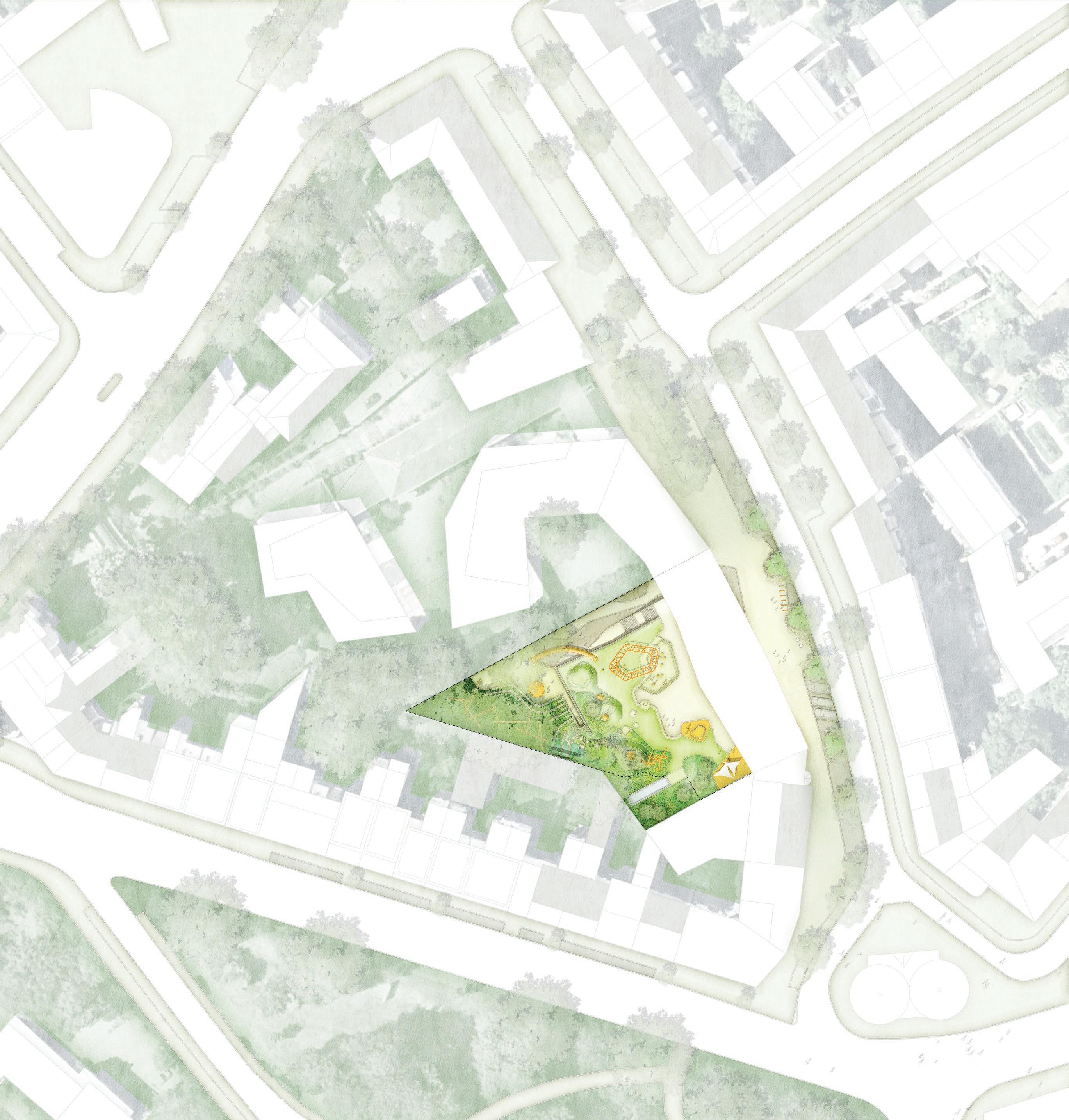 An zentraler Stelle der Aachener Innenstadt- unweit des Kleinmarschiertores an der Franzstraße- ist eine Kita mit 6 Gruppen und zwei Einfeld Sporthallen geplant. Die Kita fügt sich auf selbstverständliche Weise in ihrer Höhenentwicklung und in ihrer Gebäudetiefe in den bestehenden Blockrand ein. Trotz der Enge des Baufeldes und der komplexen Topografie vor Ort ist das Ziel, den Kindern im Blockinneren möglichst viele nutzbare Gartenflächen zum Aufenthalt im Freien und maximalen Bezug zum Grünraum zu bieten. Im übertragenen Sinn entsteht tatsächlich ein „Kinder- Garten“.