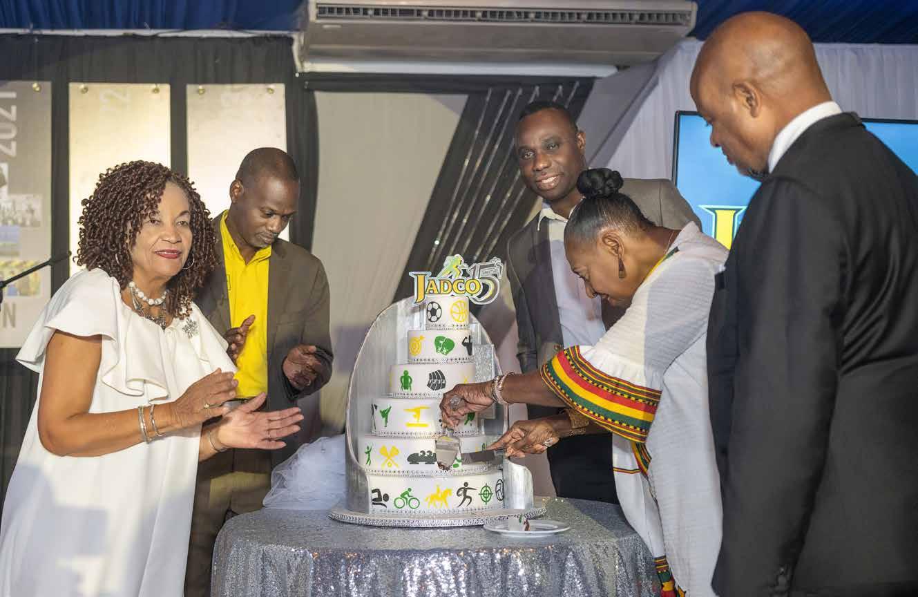 The Hon. Olivia Grange, (2 nd right) Minister of Culture, Gender, Entertainment and Sport, cuts JADCO’s 15th anniversary cake at its Crystal Gala on Tuesday, July 25, 2023. Sharing in the moment are June Spence Jarrett (left), executive director and Alexander Williams, (right), chairman, both of JADCO, Denzil Thorpe (2nd left) and Dean-Roy Bernard (centre), both permanent secretaries in the Ministry.