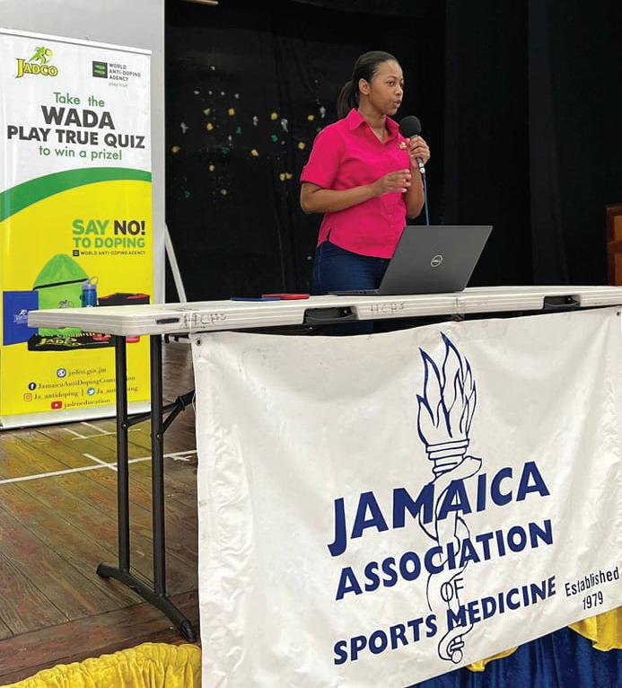 Tajae Smith, Director, Technical Services, JADCO, delivers a presentation on the doping control process at Rusea’s High School on Wednesday, February 8. This was the first stop in the 2023 series of the JADCO School Tour in Hanover.