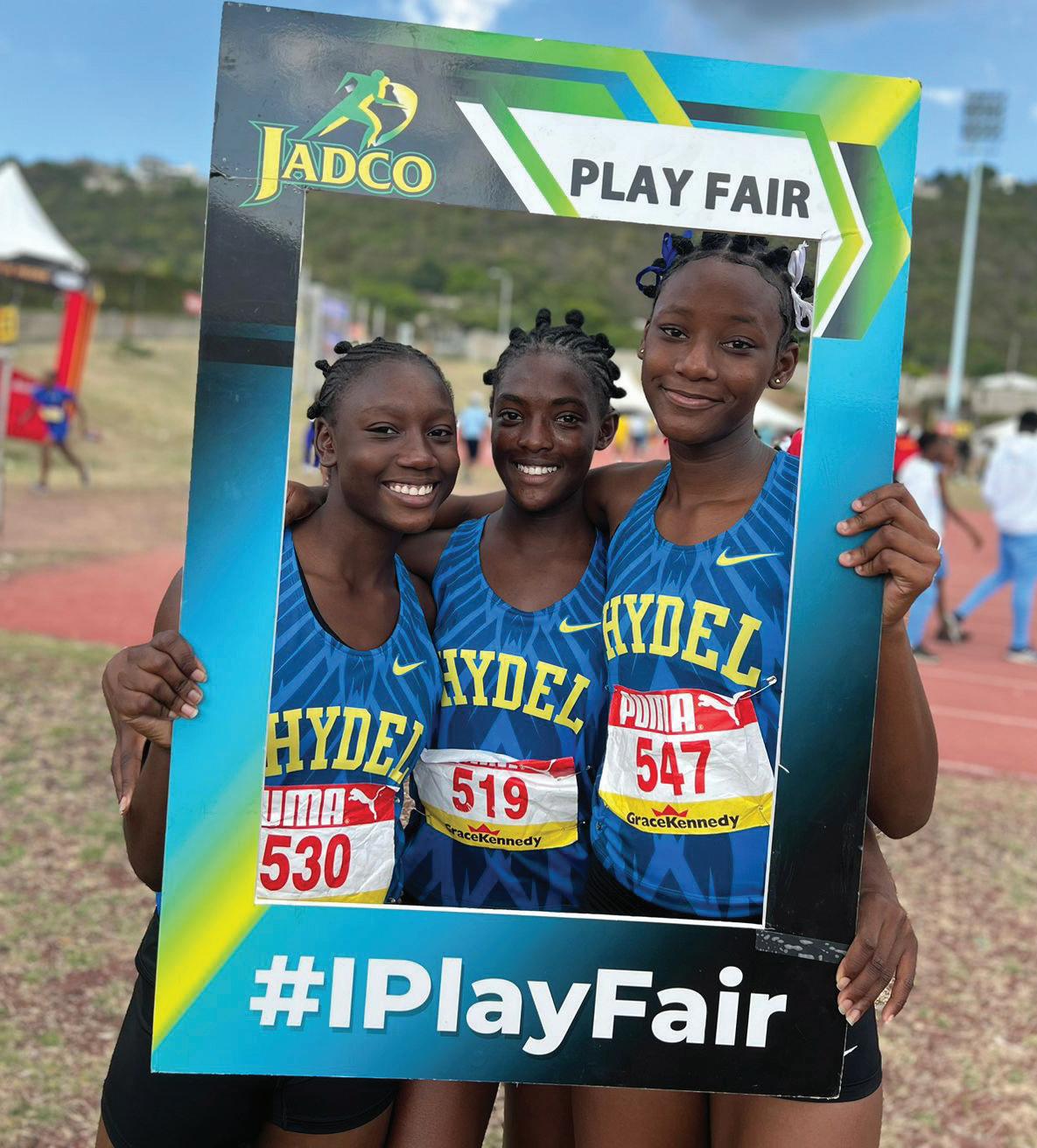 Onetta Michell (left), Sashana Johnson (centre) and Ramiella Williams (right), all of Hydel Group of Schools, endorse the Play Fair Campaign at the 2023 ISSA/GraceKennedy Boys and Girls Championships which was held at the National Stadium from March 28 to April 1.