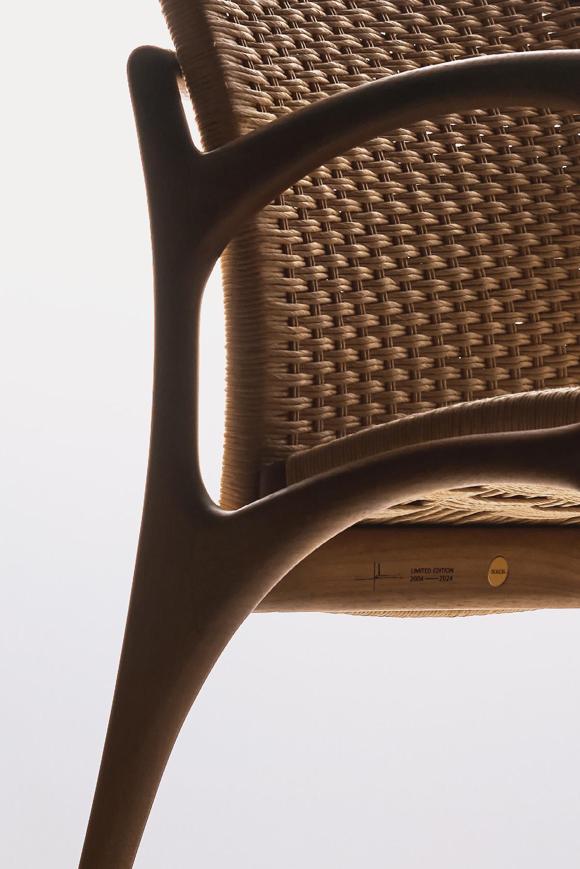 La firma del creador, Jader Almeida, aparece grabada en una pirografía refinada, esculpida con precisión láser, otorgando un sello exclusivo a la edición limitada de la silla DINNA, un completo testimonio de la fusión entre la tradición manual y la innovación tecnológica.