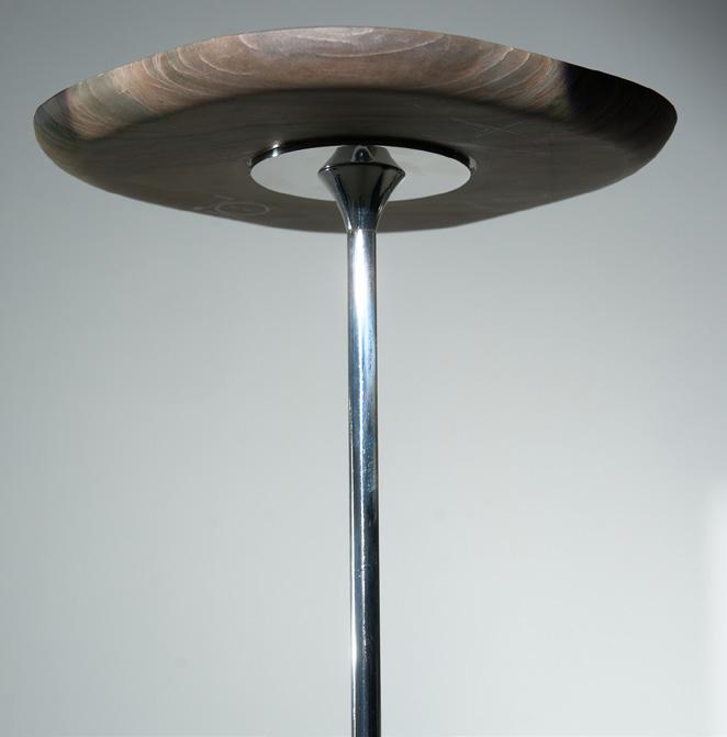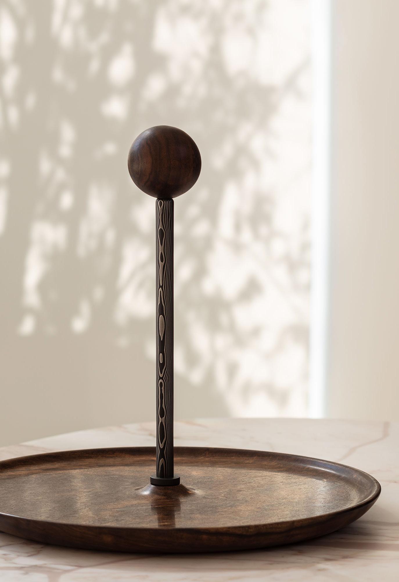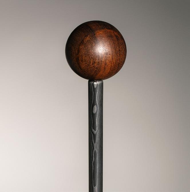 Dentre os metais escolhidos o aço Damasco, que tem uma técnica de confecção milenar, onde a junção de camadas distintas e a composição de carbono geram quase um movimento da água, mimetiza uma peça de madeira, com seus veios e desenhos orgânicos.