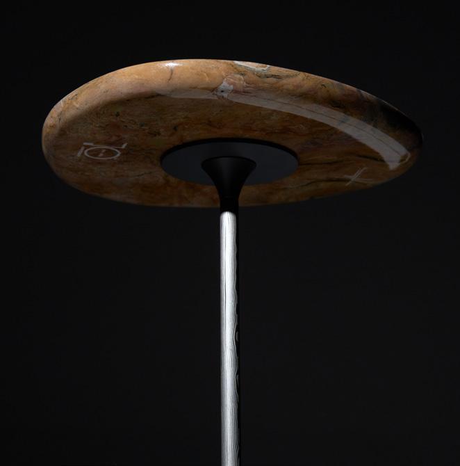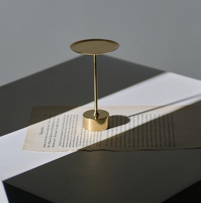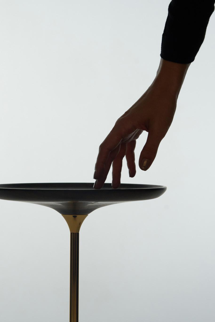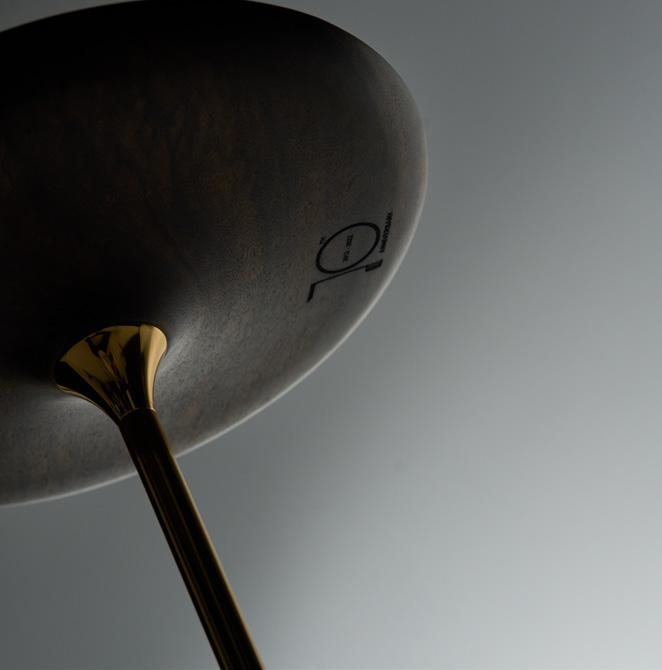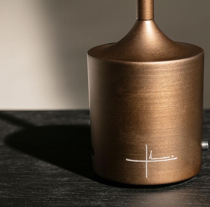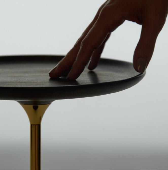 Enquanto as luminárias apresentamse em latão e em pintura bronze, tanto nos modelos à energia elétrica ou à bateria; as bandejas apresentam técnicas inéditas, como a de composição de rochas para o modelo sem alça, e de base em imbuia maciça com haste em aço damasco. Assim como os apoios, todas essas peças são perfeitas para qualquer ambiente.