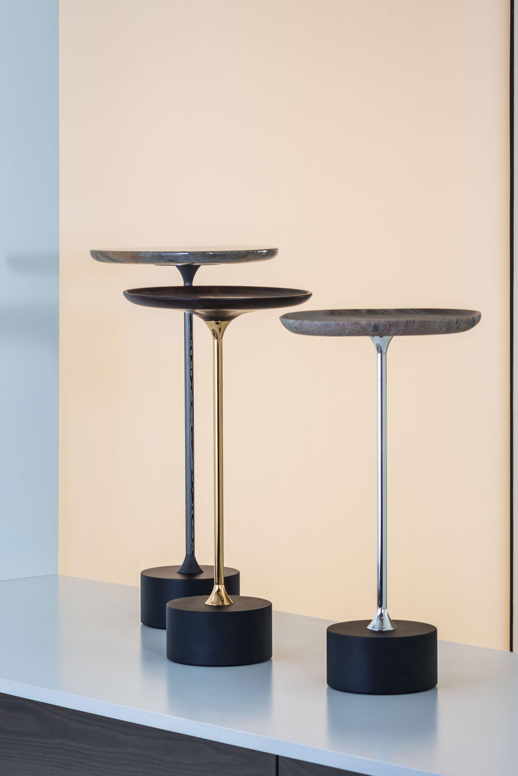 Jader ainda enfatiza que “as hastes podem ser confeccionadas diversos tipos de metais materiais, que quando combinados entre tantas opções de tampos tangem ao infinito”. Ano após ano, a peça recebeu algumas atualizações para melhoria de sua performance, explorou materiais e técnicas de produção fabril novascomo mármore esculpido, vidro moldado, vidro plano com aro em latão escurecido -, além de ser uma escolha certeira para quem quer presentear com um objeto original, de assinatura ímpar e com funções múltiplas que a tornam um complemento essencial à rotina de qualquer pessoa, seja para apoiar um smartphone enquanto carrega no quadro, degustar uma taça de um saboroso vinho em uma reunião com os amigos, ou mesmo aparar um bom livro em um relaxante espaço de leitura.