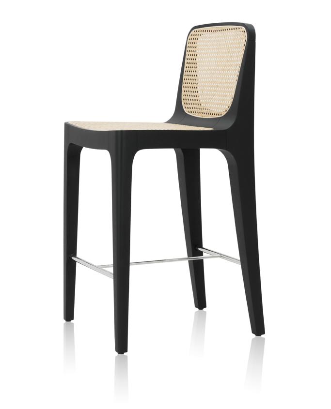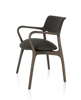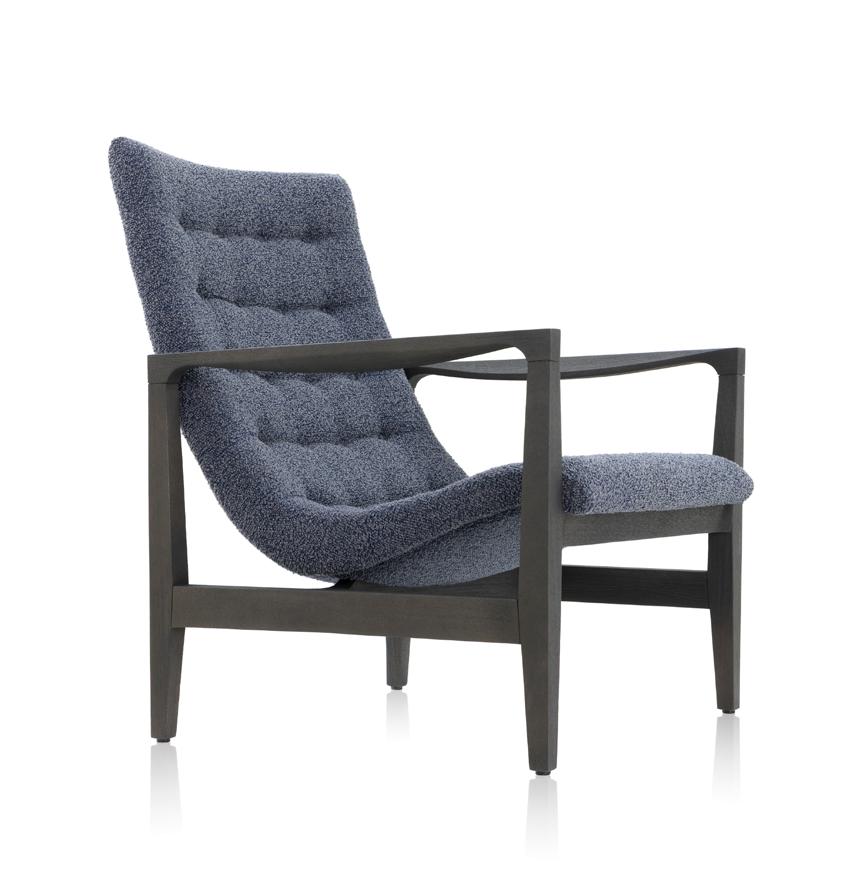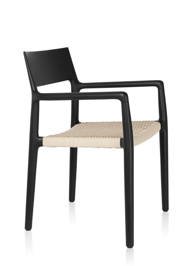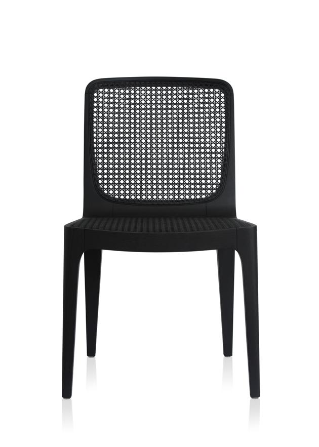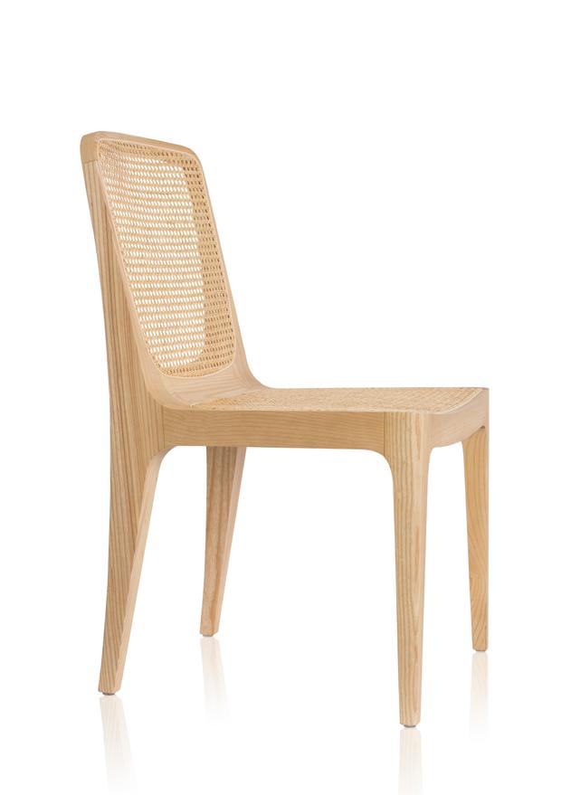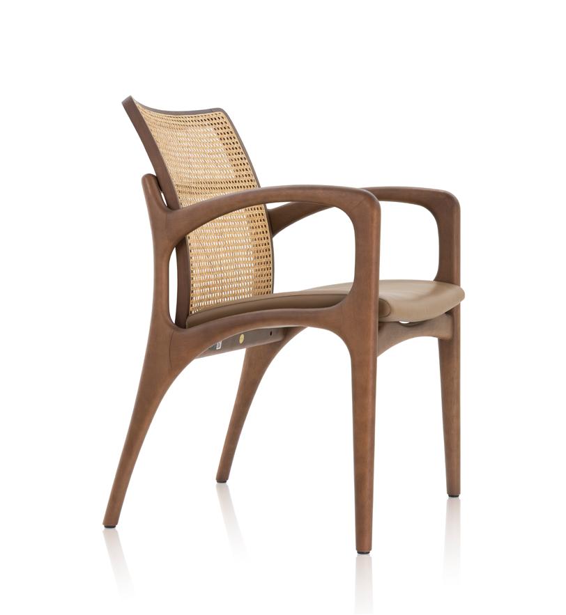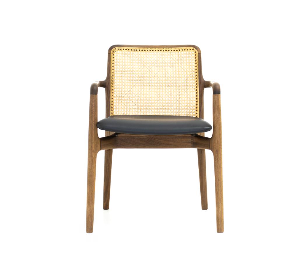Estrutura: Nogueira natural; Assento: Tecido intricate graphite mix; Encosto: Rattan natural.