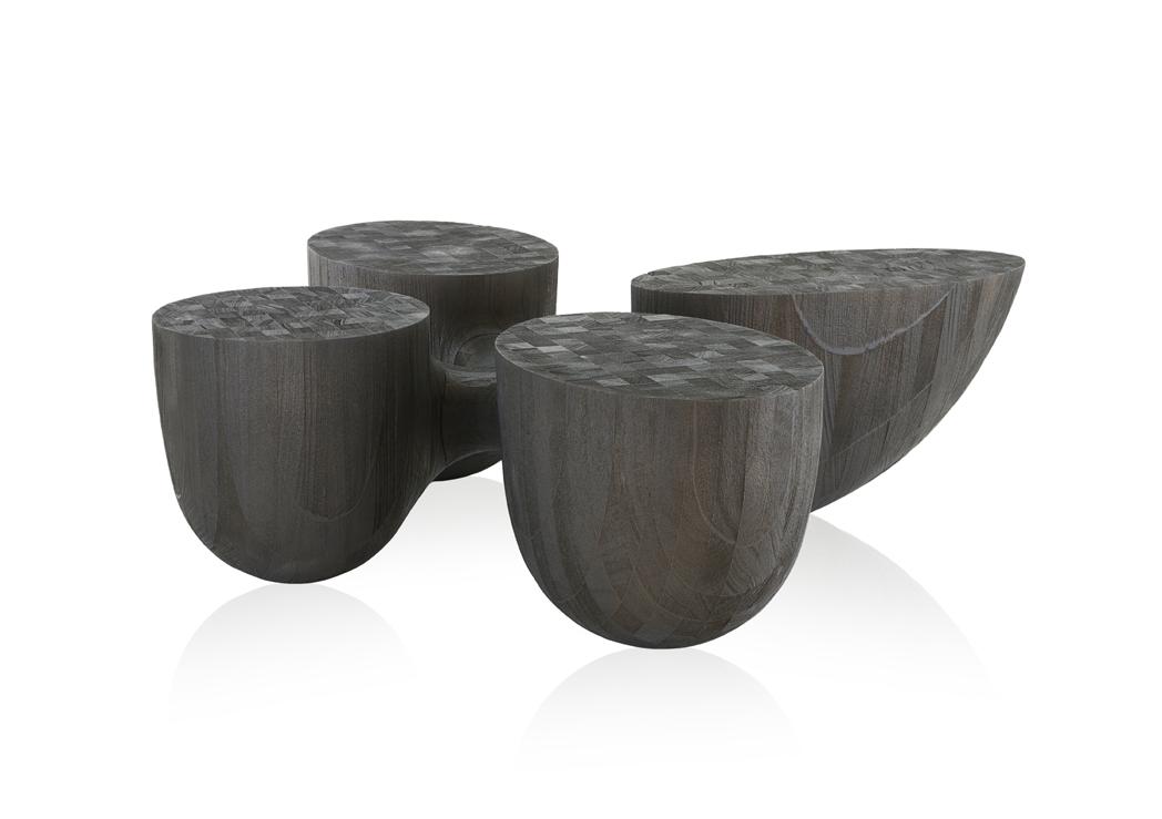 Estrutura: Aço carbono laca preto fosco; Tampo: Pedra sabão fosco; Ripado e base: Tauari tingimento feu II;