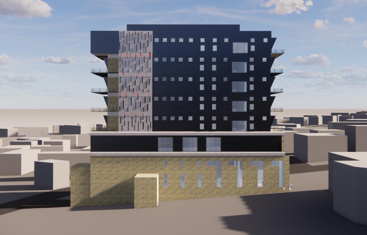 The site used to be home of a steel and concrete production company leaving behind a solid foundation of conrete. This existing concrete will be used for parking which is loacted on the west side of the building. The existing concrete will also be used as foundation for the building.The site gradually slopes down towards the train tracks, creating a 10ft drop from the edge of the street onto the site. The site currently has no sidewalks and no street lights, so for the safety and comfortability of pedestrians and residents, sidewalks and street lights will be added. In addition, the surrounding buildings and the previous steel manufacturing company will influence the material palette for both the exterior facade and the interior finishings.