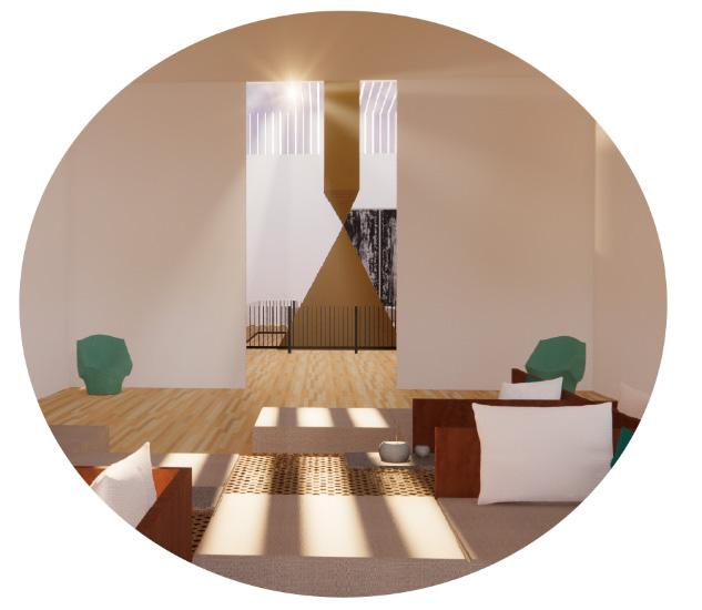 The study and use of primary colors such as red, yellow and blue creates secondary colors. The three primary colors will overlap and create the three secondary colors to give the perception that all six colors are physically present. The overlapping of colors will be arranged so that as the colors intersect, there’s moments of rest and reflection and shown as you look out outo the garden. The exterior glass flows into the interior space, assiting with creating vibrant atmosphere in the corridor.