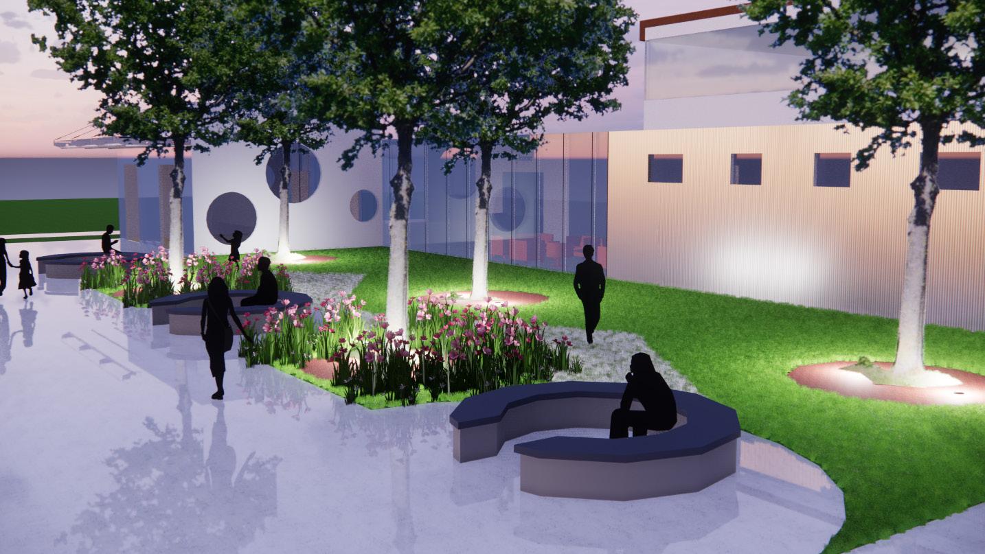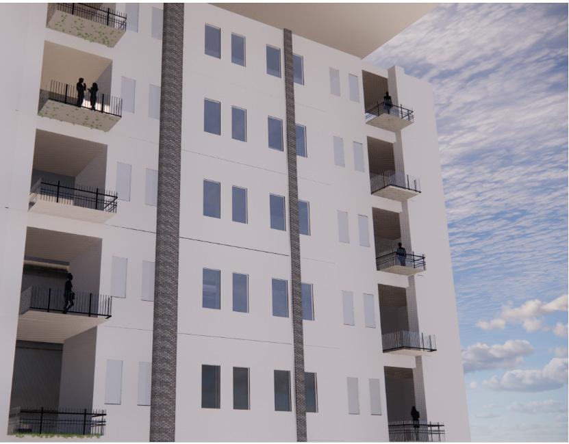 The barren site sits along Norfolk Avenue SW and in between 8th street to the west and 7th street to the east. With a railroad north of the site, it was important to consider the loud noises from the trains throughout the day and especially at night. The brick veneer and the previous metal manufacturing company, influenced the sand lime grey bricks and aluminum facade. To rejuvenate the site, there was a huge focus on an inviting public plaza and an outdoor terrace. These two create grand entrances onto the site providing lots of green spaces, trees and seats. As indicated with the red arrows, residents and vistors will have four entry ways unto the site from 8th street where parking is, Norfolk Avenue where the lobby entrance is and 7th street where the plaza.
