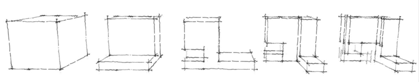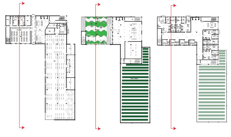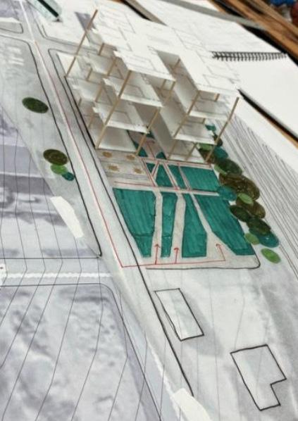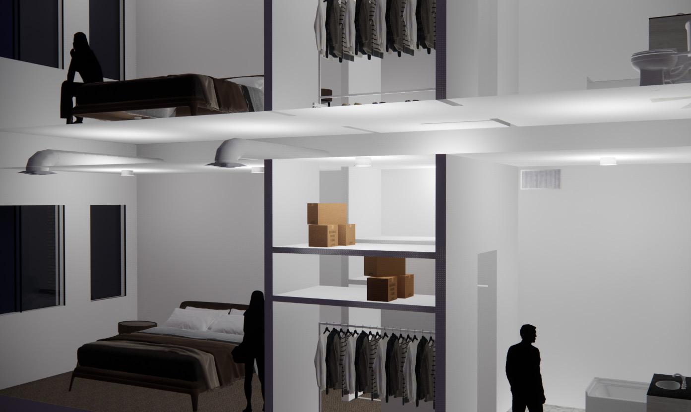 These set of iterations helped to finalize the overall design. To hide the train tracks as much as possible, the market sits south of the train tracks. Also pushing the market to the northen part of the site allowed vistors to get a perspective view as they passed Chandler concrete masonry shop. This also allowed for the possibility explore the plaza. The plaza helps to create a welcoming grand entrance from both Norfolk Avenue and 7th street. The axis that cuts through the space creating a passage between the community hub and the market helped to allow a smooth transition from the parking lot onto the plaza. With the exisiting concrete slab, it was useful to use that to create parking which required for additional concrete to be poured to provide the foundtion for the ground level floors. It was important to thoroughly examine the room adjacency. Residents should feel like they don’t have to leave the space and everything they could possibly need is right downstairs.