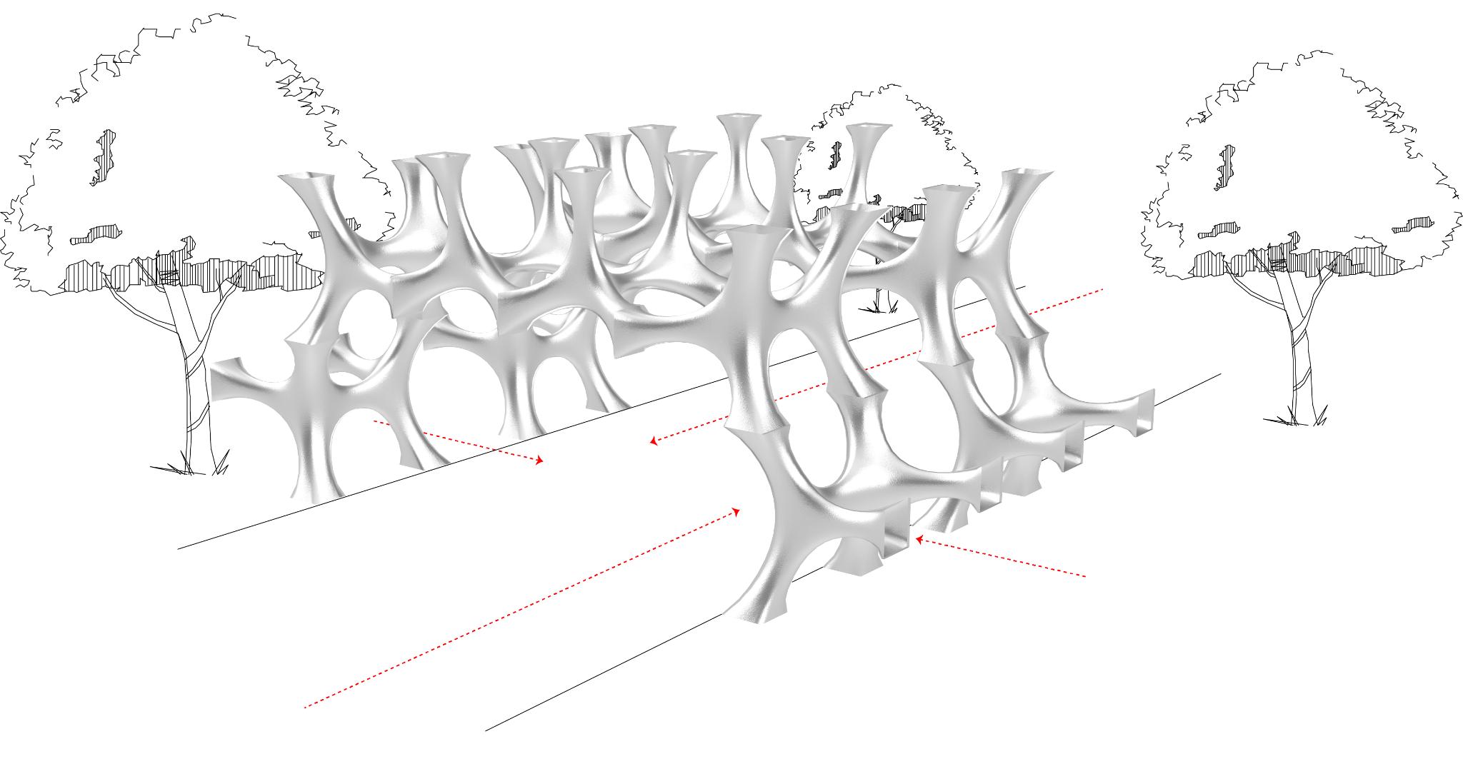 Through exploring the Rhinoceros 3D extension “Grasshopper,” this primitive was constructed by connecting multiple solid surfaces and then removing some surfaces to create voids. By removing these surfaces, it allowed us to create a more refined and precise mesh geometry system.