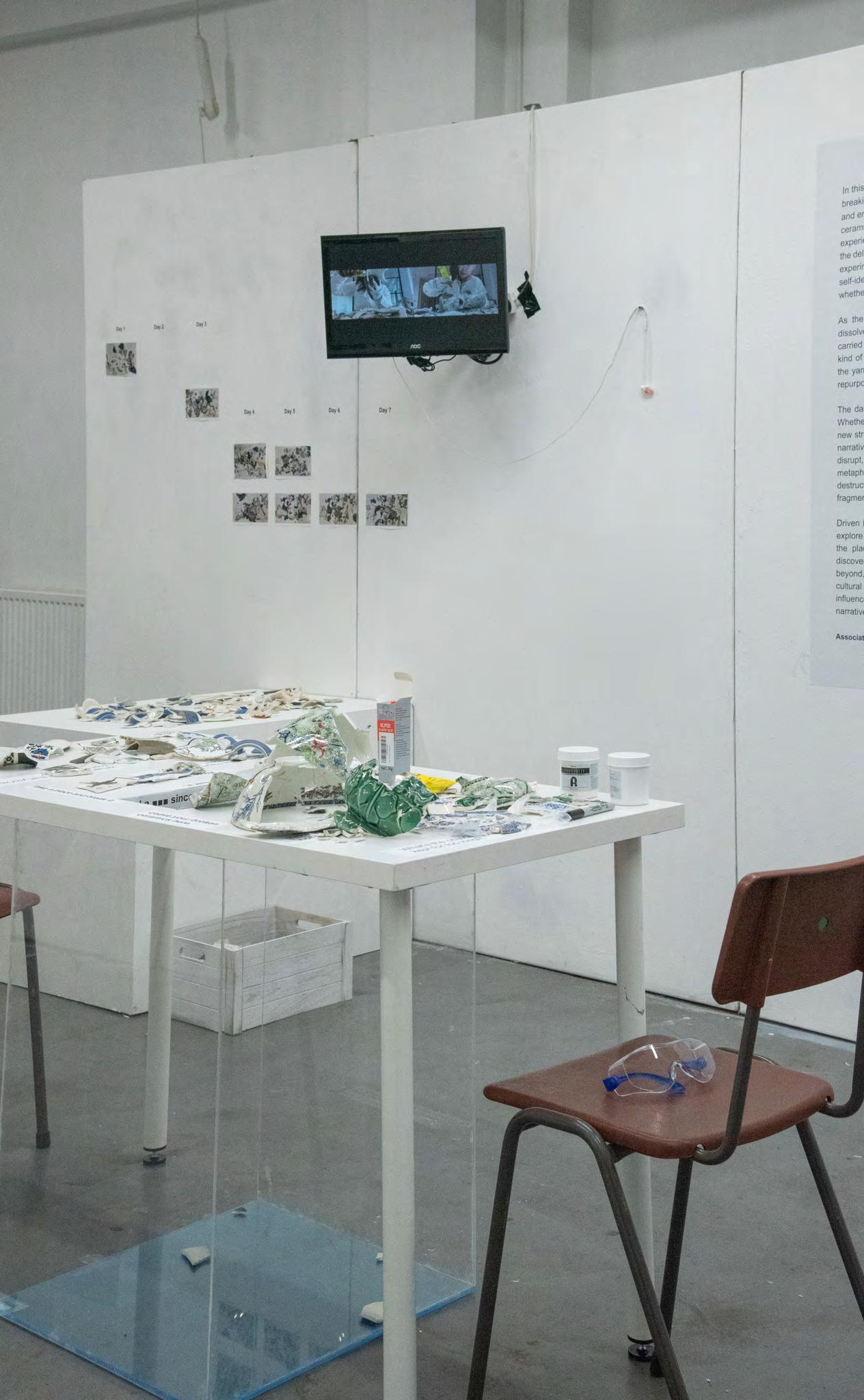 The daily cycle of breaking and mending ceramics furthers this experiment. Whether it is an attempt to restore their original forms, or constructing entirely new structures, this daily repetition challenges the tendency to hold onto past narratives that no longer serve us. The artist invites the audience to engage, disrupt, and take what they need from the process, both physically and metaphorically. Here, violence becomes a tool for release and renewal, using destruction as a way to explore how new possibilities can emerge from the fragments of the old.