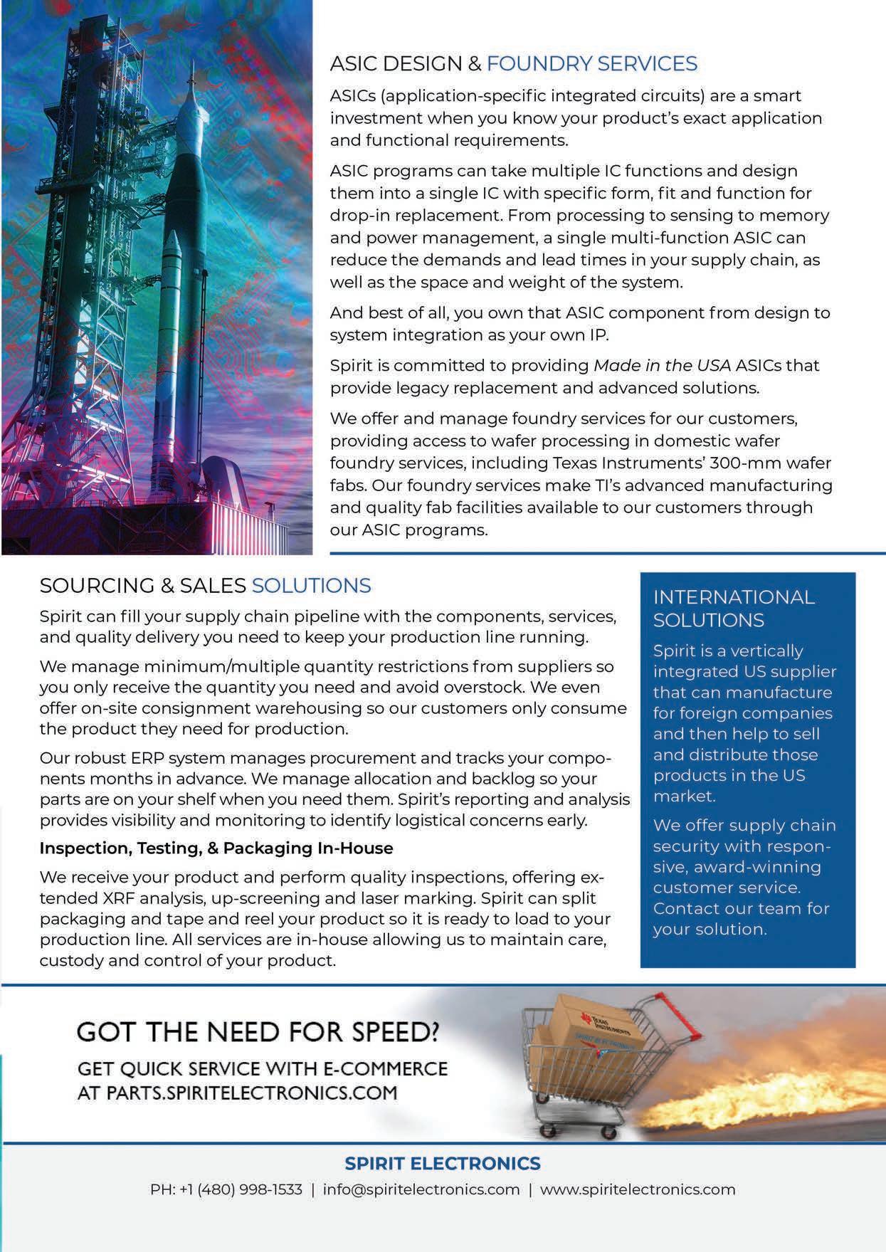 With a market shift to onshore semiconductor production, Spirit provides a made-in-theUSA supply partner for authorized components, testing, and assembly, managing export control and counterfeit prevention requirements to include a wider range of OEMs in a secured supply chain. We constantly improve our business practices and operations to meet requirements like cybersecurity. We plan to continue service and capacity expansion to meet the market demand. Our team is solution-focused, looking for innovative ways to meet customer needs, whether the challenge is allocation limits on supply or production fluctuations.
