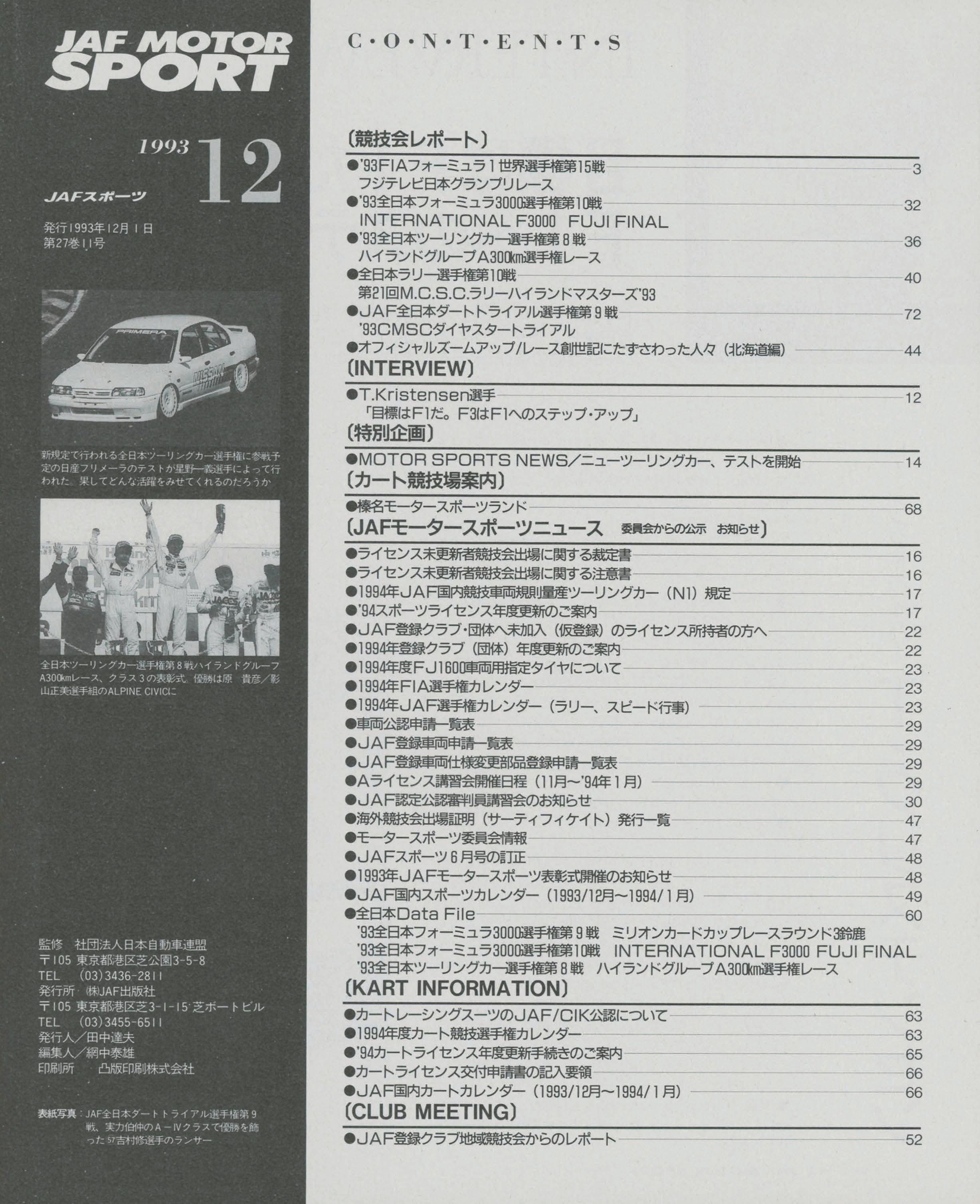 JAFスポーツ 1993年 12月号(第27巻 第11号 1993年12月1日発行)