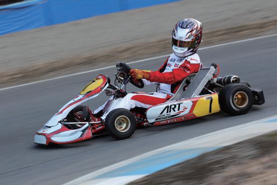 快晴の下で戦いの火蓋を切った第1戦の決 勝。ポールの三村選手はオープニングラップで 大きなリードを築くと、5周で後続を1秒半も後 方へと突き離す。シャシーをマラネロカートから ART GPに、タイヤをブリヂストンに替えて心 機一転の新シーズンに臨んだ三村選手は、快調 そのもの。誰にも影を踏ませぬ独走を続け、
