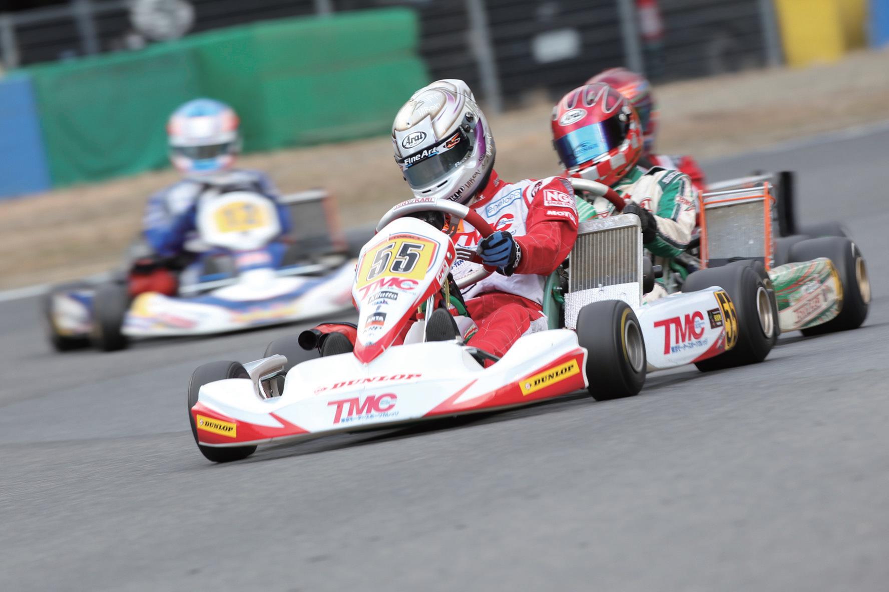9. 全日本FS-125で5番 手からスタートの渡邉俊輝選手は2位でゴール。10.11. 全日本カート選手 権 FS-125部門東地域第1戦は、PPから先頭を行く田中海輝選手に後続 集団が追い付き、決勝中盤からは4台一丸の優勝争いに。この苦境を懸 命に乗り切った田中選手が、同部門3戦めで初優勝を果たした。