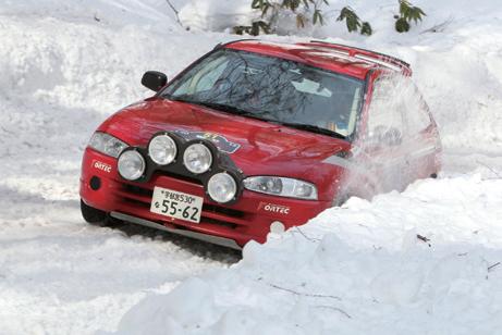 雪と格闘する傳寶。「ハーフスピンを 立て直したり、前回より凄くうまくな ってる。先はあるドライバーだと思う よ。クルマを壊さなければね(笑)」と ナビの和田はエールを贈った。