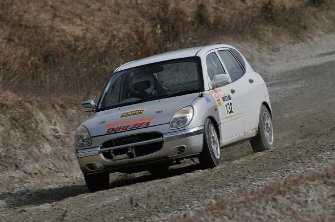 ストを連発して食らいついてきた二野下幸夫組の CA4Aミラージュ。昨年12年ぶりにラリー復帰 を果たした、ランサー使いとして知られた中四国 地区の元トップラリーストだが、「去年1回このク ルマで走ったらFFの走りができてないと周りか ら笑われたんで(笑)、今年はもうタイヤ8本も使 って、その辺は練習してきました」と完全復活の 走りを披露。その後もぶっちぎりのベストを叩き 出して逃げ切った。