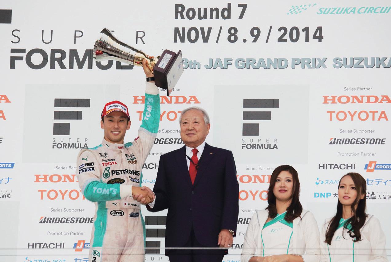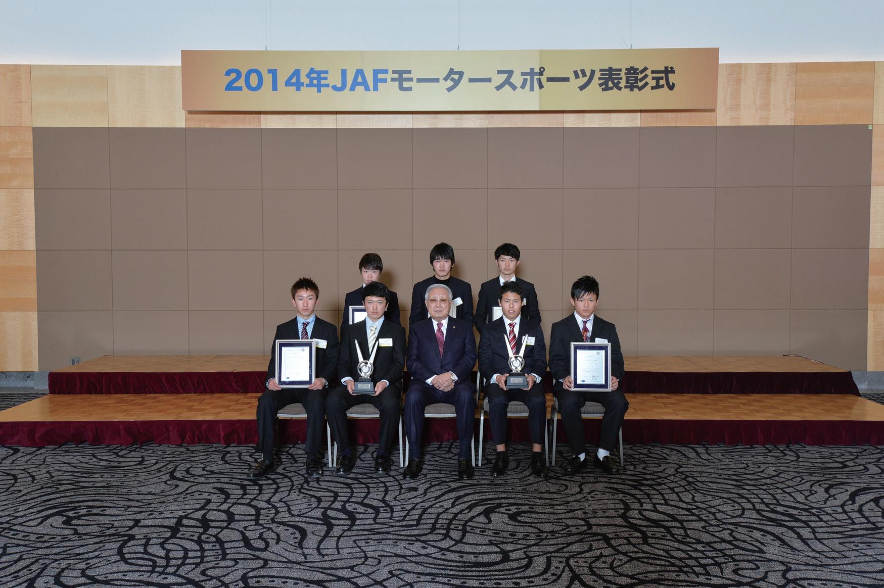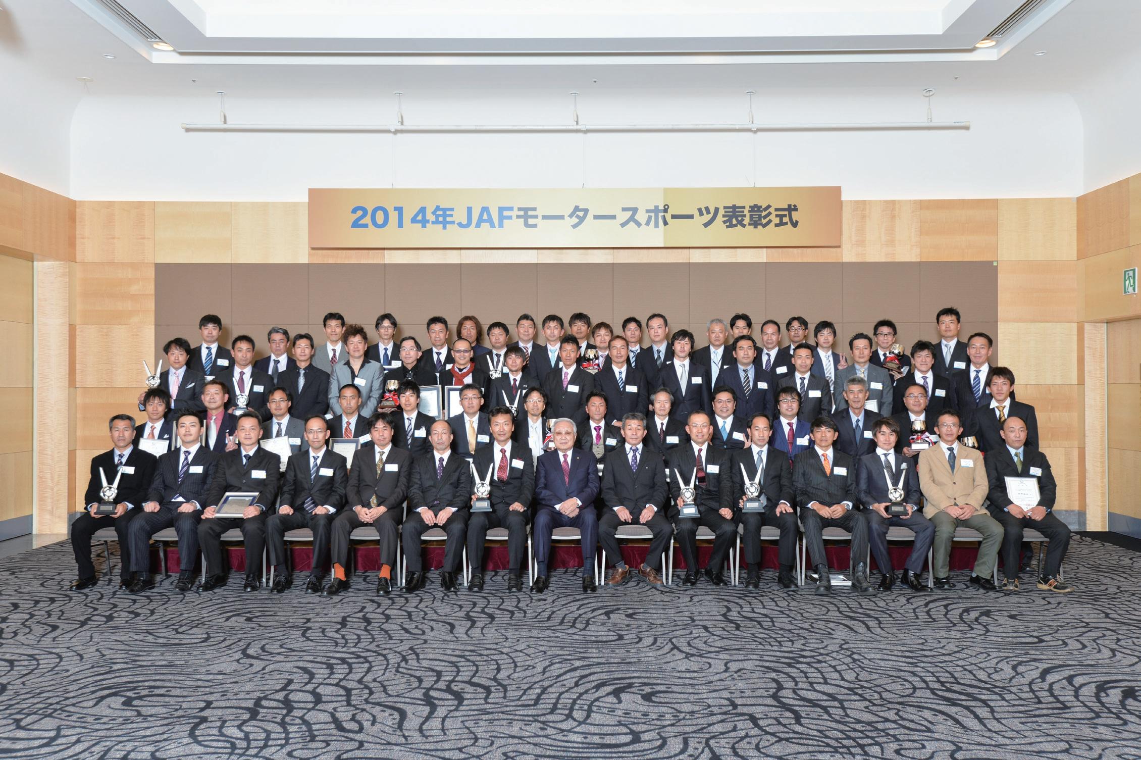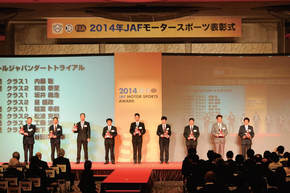 まず、長年モータースポーツ界の発展に尽力された方々に贈ら れるJAFモータースポーツ名誉委員の称号贈呈から式は始まり、 2014年はレース界でご活躍を続けてこられた東名パワードの鈴木 修二氏が受賞された。