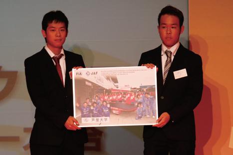 今回の表彰式では8月に行われたソーラ ーカーレース鈴鹿でFIA代替エネルギーカ ップ対象となった3チームが表彰された。 左からオリンピアクラス優勝の芦屋大学ソ ーラーカープロジェクト(B)、4時間耐久レ ース総合優勝の平塚工科高校社会部(クラ スⅠ優勝のOSU大阪産業大学は欠席)。