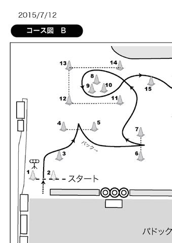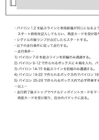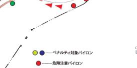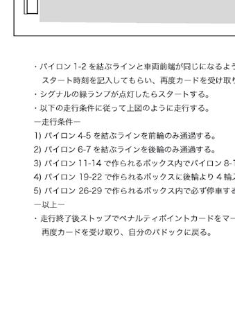 1台出走のためやや長めの設定となった決勝コ ースは、スタート地点から最下段のソックスコーナ ーまでS字を描くように往復する設定で、途中で タイトなシケインを設けたり、タコツボを逆走で使 ったり、ゴール直前には難しい位置に規制パイロ ンを設置するなど、地元有利にならないテクニッ ク重視の配置となっていた。