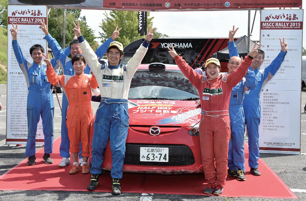 競技歴20年を超えるベテラン砂川里美選手(写真中) はDE5FSデミオを駆りN1500&PN1クラスを戦う。「始 めた当時はレディス全盛期で、大井こずゑ選手や太田直 美選手たちの男性顔負けの豪快な走りに憧れてました。 結婚など“やめどき”は色々あったんです。実際、子供 の受験で活動休止したんですが、お金が貯まっちゃった ので、新車のデミオで競技車を作っちゃいました(笑)。 なかなかやめられないもんですね」