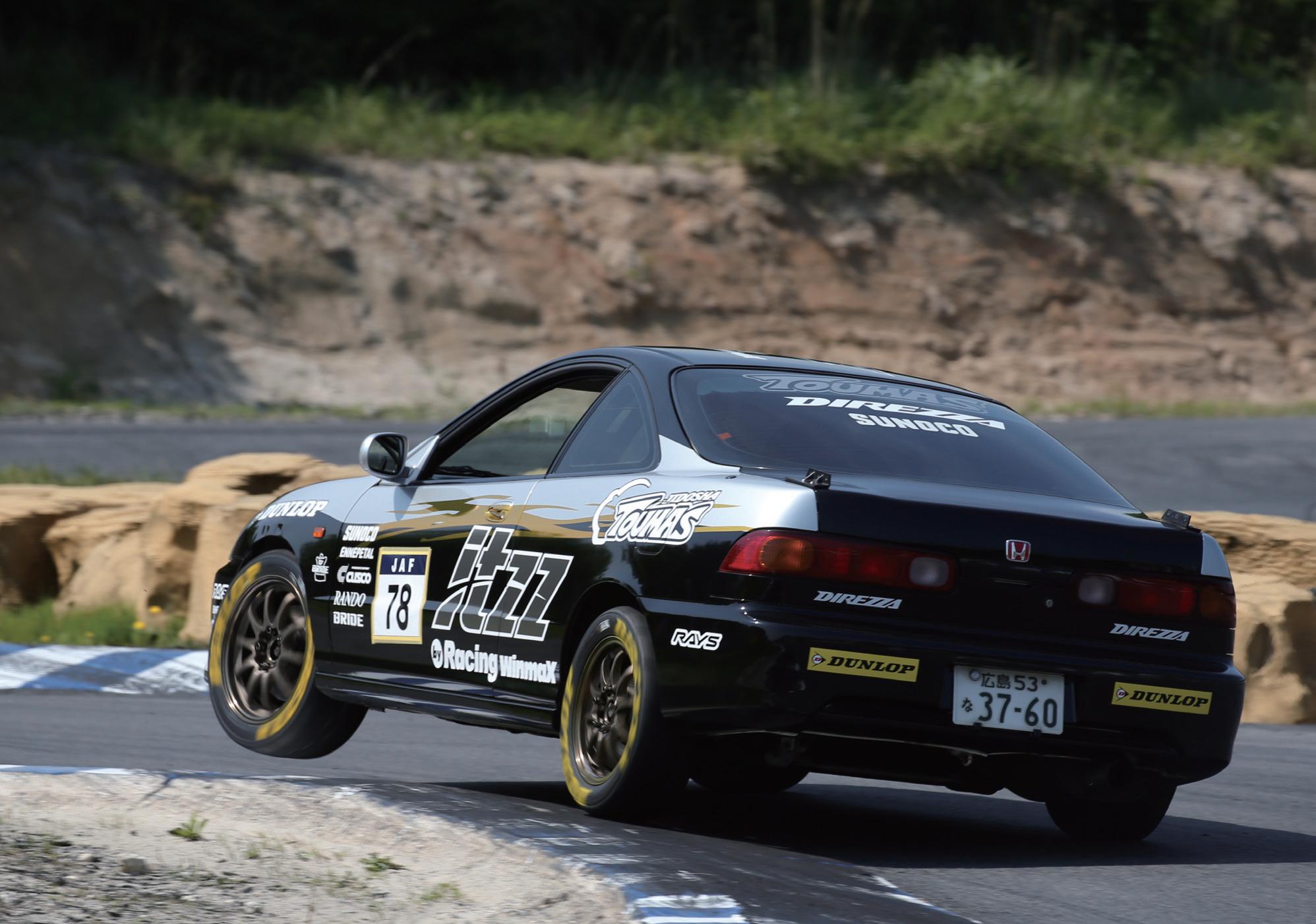 JMRC東北戦クラス2で痛車のFD2シビックを走 らせる後藤和宏選手。「このFD2は今年で7年めで す。最初は仙台ハイランドなどを走ってましたが、 長く続けられそうなジムカーナに転向して、秋田県 戦のラジアルクラスを 戦ってます。カラーリ ングはカッティングま でを自分で行い、岩 手『エッジグラフィッ クス』で貼ってもらい ました。こんなクルマ なら若い人が声を掛 けやすいと思って始め たんですよ」。