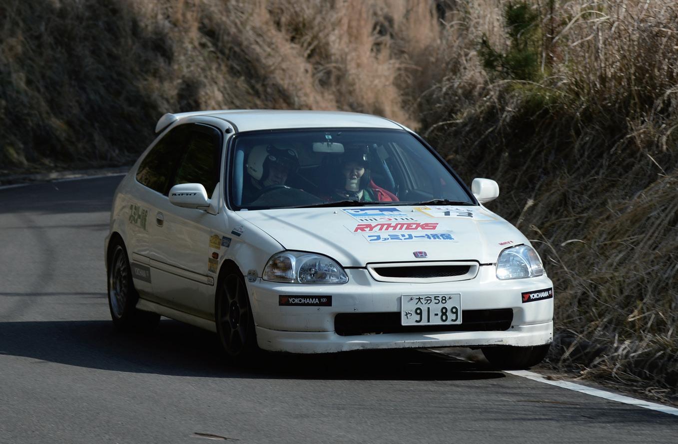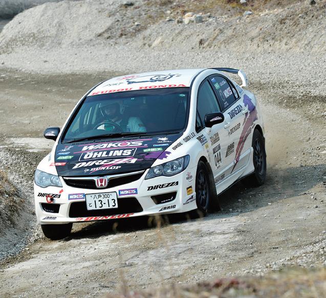 一方、2輪駆動のトップクラス、 JN5クラスには計8台のマシンが 集結した。その中でラリーの主導 権を握ったのが、ホンダ・シビッ クを駆る黒原康仁/久木野理恵 組だった。3連覇を狙う黒原組は 「予算的に厳しいのでラジアルタ イヤにしました」と語るものの、 SS1から5本連続でSSウインを 獲得し、後続を大きく引き離す。