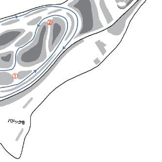 注目のコース設定はキャロッセコーナーは使わ ず。橋を渡った後の右コーナーから一番、外側を 通り、そこから右に切り込む設定は地区戦でも初 設定。特にこのRの大きい右コーナーは入口が狭 く、攻略に戸惑ったドライバーが多かった。