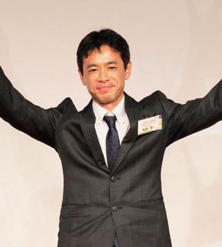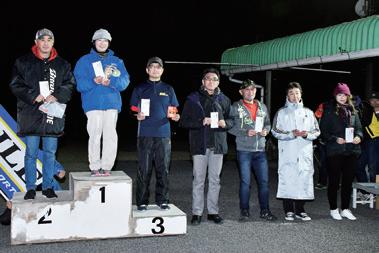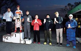 14 台が出走したノーサイド表彰式。優 勝の大江美由希選手、2 位中村聡一選 手、3 位相馬直孝選手、4 位松本浩選手、 5 位もあ選手、6 位横溝隆司選手。