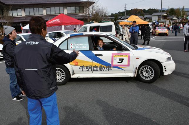 千葉から参加のダートラドライバー藤澤 久美子選手は同じクラブの蔭山恵ナビのサ ポートを得て出場。「ラリーは以前から出た いなって思ってたんで、最初はどうしよう かなって迷いましたが、女性だけのラリー だったら出やすいかなと思って出場を決意 しました。女性だけの勝負だと却ってピリ ピリ感もあるかなって思われるかもしれま せんけど、自分はそこまで勝負できるほど 速くないので大丈夫でした(笑)。コースも 怖くなかったですけど、ライン取りはちょ っと迷うところもありました。18 年は群馬ラ リーシリーズに出たいと思っています」