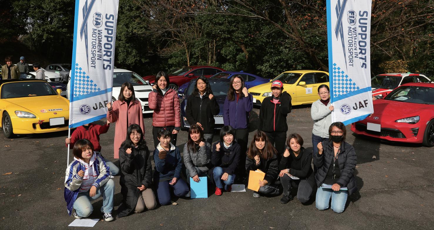 また、今回は参加者の約1/3が女性選手 というのも特筆すべき点で、JAFウィメン・ イン・モータースポーツ作業部会からも幟 旗が貸与されている。その立役者となった 河合豊美選手によれば、オートテストなど で女性参加者に声を掛けたり、女性ジムカ ーナドライバーに興味がありそうな女性の 参加を促してもらうなどして、このレッス ンへの参加を募ったそうだ。