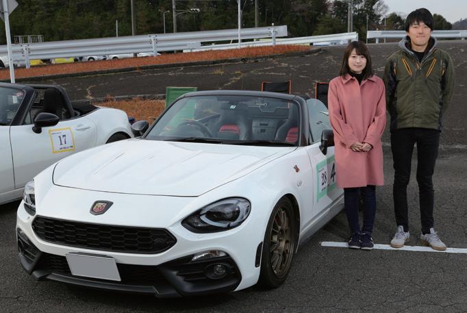 良選手、大前尚史選手、石原裕也選手、磯 村良二選手、柏木良文選手、上本昌彦選 手、森嶋昭時選手、加田充選手、小澤忠司 選手、妖怪J清本選手、前島孝光選手らと 光之選手、佐藤巧選 手、望月健太郎選手、 下原幸登選手、緒方和 いうことで、レジェンド級のドライバーや 全日本選手権及び地方選手権チャンピオン などなど、錚々たる面々が協力していた。 全日本ジムカーナ選手権では4度のタイ トルを獲得している森嶋選手は、レッスン の講師として2度目の登場となった。 「ジムカーナをやってみたいけど、敷居が 高そうとか思っている方とかに、実際に体 験して知ってもらうのにはすごく良いイベ ントだと思います」と話しつつ、「ジムカー ナ経験のある僕たちが走ることで『それを見 て走りたいと思う人もいるはず』と言われた ことがあるんです。競技会本番の走りも大 事ですが、こうした機会は大切です。これ からも関わり続けようと思っています」と語 ってくれた。 今回のレッスンは午後からの開催だった が、多い人では15本以上も走り込むことが できたようた。通常の練習会やフリー走行 に単身で参加すると相対的な評価が得られ にくく、自分の成長や課題は理解しにくい ものだが、現役選手がしっかりと評価をし てくれるこのレッスンは、初心者ならずとも 得るものが大きい機会となったに違いない。 斉藤怜央選手/兼松由奈選手 NF2EKアバルト124スパイダー 斉藤選手は現在社会人2年目でモーター スポーツ歴は大学の自動車部からとのこ と。今回はアバルト124スパイダーでダ ブルエントリー。「サーキット走行や趣味 でエビスの耐久レースに出ています。FR で過給器付きのクルマでジムカーナは 今日が初めてなので、今日は楽しいです ね。これまでとは違った難しさと面白さ