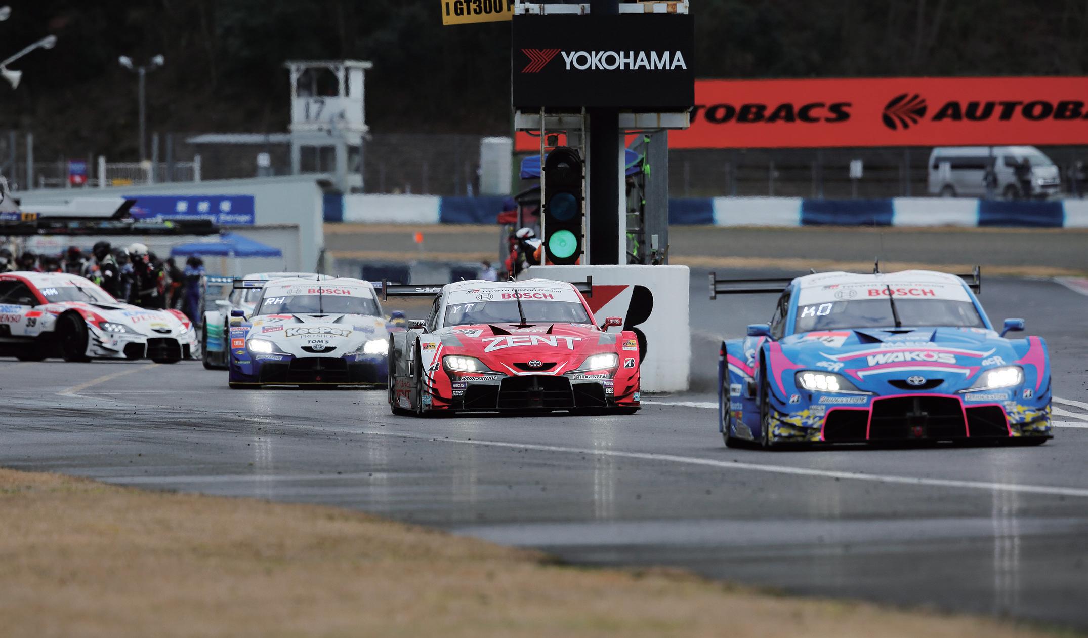 は記録されなかった。 セッション3はWAKO’S 4CR GR Supraの坪井選 手が、セッション4はZENT GR Supraの石浦選手が トップだったが、初日のセッション2でバゲット選手が 記した最速タイム、1分17秒850は更新されなかった。 今回の全体的なホンダ勢の好調ぶりは、正直言って 意外な感も。NSX-GTをFR化せざるを得なかった、と いうネガティブな印象が一切なかったからだ。 一方、トップタイムこそ記されることのなかった日産 勢ながら、松田選手とクインタレッリ選手の駆る、 MOTUL AUTECH GT-Rが絶えず上位につけて安定 感をアピール。そもそもテストはそれぞれメニューが異 なることが多々あり、タイムだけがすべてではない。願 わくは、実力伯仲の戦いとなることを期待したい。 WECでおなじみティーム選手が参戦 GT300におけるトピックスは、ミシュランの復帰 だろう。これでGT500同様、タイヤメーカー4社で の戦いになる。新たにミシュランを装着するのは、ア ストンマーティン・ヴァンテージGT3を走らせる PACIFIC-D’station Racingと、レクサスRC F GT3 を走らせるLM corsa。マッチングが進めば、大きな 武器となることだろう。藤井誠暢選手と吉本大樹選手 のパートナーは、それぞれ、アストンマーティン・フ 2020年スーパーGT GT500クラスチーム体制(2月中旬までのメーカー等の発表に基づくJAFスポーツ編集部調べ) トヨタ TGR TEAM WAKO'S ROOKIE 14号車 大嶋和也選手/坪井翔選手 WAKO'S 4CR GR Supra BS TGR TEAM WedsSport BANDOH 19号車 国本雄資選手/宮田莉朋選手 WedsSport ADVAN GR Supra YH TGR TEAM au TOM'S 36号車 関口雄飛選手/サッシャ・フェネストラズ選手 au TOM'S GR Supra BS TGR TEAM KeePer TOM'S 37号車 平川亮選手/ニック・キャシディ選手 KeePer TOM'S GR Supra BS TGR TEAM ZENT CERUMO 38号車 立川祐路選手/石浦宏明選手 ZENT GR Supra BS TGR TEAM SARD 39号車 ヘイキ・コバライネン選手/中山雄一選手 DENSO KOBELCO SARD GR Supra BS ホンダ ARTA 8号車 野尻智紀選手/福住仁嶺選手 ARTA NSX-GT BS TEAM MUGEN 16号車 武藤英紀選手/笹原右京選手 MOTUL MUGEN NSX-GT YH KEIHIN REAL RACING 17号車 塚越広大選手/ベルトラン・バケット選手 KEIHIN NSX-GT BS Modulo Nakajima Racing 64号車 伊沢拓也選手/大津弘樹選手 Modulo NSX-GT DL TEAM KUNIMITSU 100号車 山本尚貴選手/牧野任祐選手 RAYBRIG NSX-GT BS 日産 NISMO 23号車 松田次生選手/ロニー・クインタレッリ選手 MOTUL AUTECH GT-R ML NDDP RACING with B-MAX 3号車 平手晃平選手/千代勝正選手 CRAFTSPORTS MOTUL GT-R ML TEAM IMPUL 12号車 佐々木大樹選手/平峰一貴選手 カルソニックIMPUL GT-R BS KONDO RACING 24号車 高星明誠選手/ヤン・マーデンボロー選手 リアライズコーポレーションADVAN GT-R YH 2019年チャンピオンの大嶋和也選手はチーム 体制を改められたTGR TEAM WAKO’S ROOK IEで、坪井翔選手とコンビを組む。 公式テストでトップタイムをマークしたのはNSX-GTを駆るベ ルトラン・バゲット選手。 日産勢では12号車・佐々木大樹選手のパートナーに平峰 一貴選手が抜擢されている。 今シーズンから導入される予定の「フルコース イエロー」の実地テストも行われた。 ※この記事は3月31日までの情報を元にしております。 22