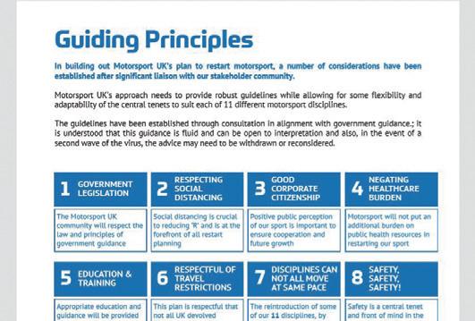 この提唱を受け、オーストラリアは同日にASN独自 の再開プラン「Return to Race」を発表。18日には英国 が「Back on Track」、27日には日本のASNであるJAF が「基本的な感染対策のあり方の例」というように、ASN が次々と自国内向けの指針を発表していくという流れ ができあがった。 FIAによる12の提唱、JAFを含む各国ASNの指針を 読み解くと「モータースポーツとイベントの開催は地域 社会の中で行われる」という点を強く意識した内容が冒