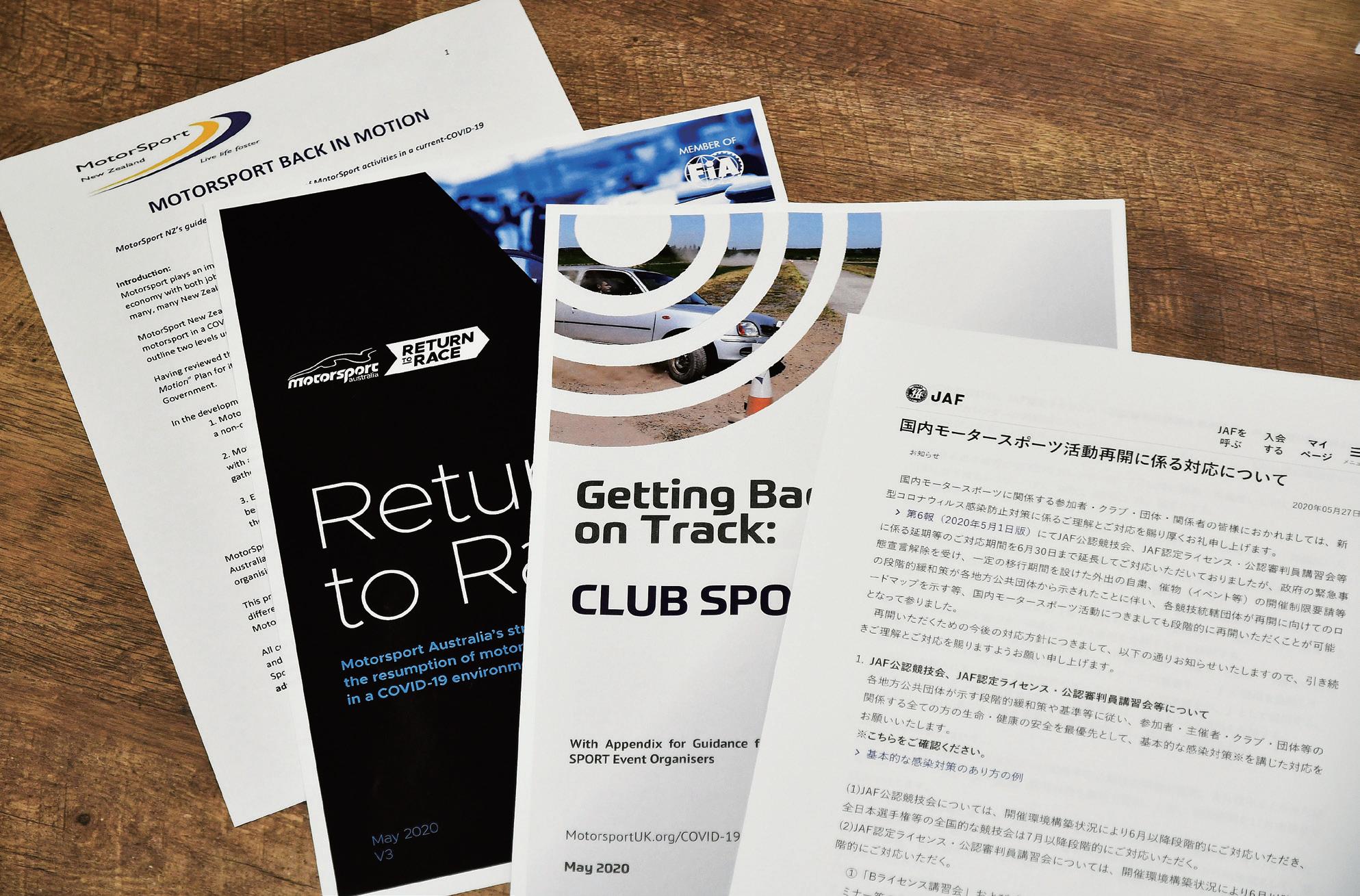 5月14日以降、続々と公開された各国ASNの活動再開ガイドライン 5月14日、FIAはCOVID-19の影響に直面する各国 ASNを統合するFIA国際協力プログラムを補完する ものとして、モータースポーツ正常化を目指すスポー ツクラブが採るべき「12のキーアクション」を提示し た。FIA副会長のグラハム・ストーカー氏がオンライ ンセミナーでもたらしたこれらの提唱を元に、各国 ASNがそれぞれの国情に合わせて方針を再構築。5 月下旬に各国ASN独自の活動再開ガイドラインとし て公表されることになった。 Graham Stoker/FIA Deputy President for Sport 「12 key actions ASNs and ACNs」 Motorsport Australia「Return to Race」 Motorsport NewZealand「Back in Motion」 Motorsport UK「Getting Back on Track 」 6月20日、FIAは「12 key actions」の存在を公表。 「WHOはモータースポーツを低リスクだと捉えて いる」という一文が示されている。 英国のASN「Motorsport UK」は5 月18日に「Getting Back on Track」 と題した活動再開ガイドラインを 公表。レース、ラリー、スピード、 カート、クラブスポーツとカテゴリー毎に作成し、8項目の分かりやすい指標や、各立場に おける役割や責任の所在、対応策を明示した。また、メディカル担当を始めとした役務毎 のガイダンスも公表している。 オーストラリアのASN「Motorsport Australia」は、5 月11日の早い段階で「Return to Race」と題した活 動再開ガイドラインを公開。COVID-19チェッカー の使用を促したり、5月22日には競技ライセンスの 自動更新の容認や、モータースポーツ復帰を考え る関係者にオンラインで概説する「COVID-19リ ソースセンター」を設置するなど動きは早かった。 ニュージーランドのASN「Motorsport New Zealand」は5月 14日に活動再開ガイドラインの策定を公表し、5月19日付 けで「Back in Motion」と題した組織の新体制構築も含めた 活動再開ガイドラインをリリース。政府のアラートレベルに合わせた指標を示しつつ、 オーガナイザーを対象とした活動再開にあたってのツールキット等を提示している。 JAF「国内モータースポーツ活動再開に係る対応について」 https://jaf.or.jp/common/news/2020/20200527-001?_ ga=2.110917125.1618726145.1593321773-1773429384.1561985290 Motorsport Australia「Return to Race」(オーストラリア) https://www.motorsport.org.au/covid-19/ Motorsport UK「Getting Back On Track」(英国) https://www.motorsportuk.org/restart/ Motorsport NewZealand「Back in Motion」(ニュージーランド) https://www.motorsport.org.nz/covid-19/ Austrian Motorsport Federation (AMF)「Covid-19 recommendations」(オーストリア) https://austria-motorsport.at/media/4623/ amf-empfehlungen-covid-19-stand-14-05-2020.pdf Deutscher Motor Sport Bund E.V. (DMSB)(ドイツ) https://www.dmsb.de/covid19/ 13