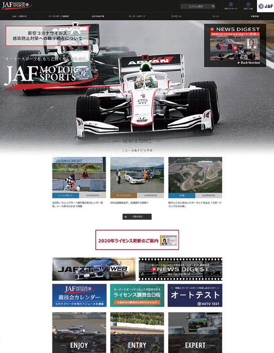 ニッポンのモータースポーツは JAF 動画サイトでチェックしよう! NEWS! スーパーフォーミュラからレーシングカートまで、国 内で開催されるJAF全日本選手権のイマを伝え る、インターネット配信を利用した 国内モータースポーツニュース情報番 組を配信中です。番組のナビゲーター は、日本を代表するレースアナウンサ ー、ピエール北川さん。毎月15日頃& 30日頃、月2回の配信予定です。 JAFモータースポーツホー ムページの特設バナーから ご覧になれますが、YouT ubeのJAF公式アカウン ト「jafchannel」からも 無料で視聴が可能です。 全日本選手権のイマを伝えるモータースポーツ・ニュース情報番組 「JAF モータースポーツニュースダイジェスト」好評配信中! JAF モータースポーツホームページ http://jaf-sports.jp JAF MOTOR SPORTS ホームページの“取扱説明書”です WEB誌面、動画、カレンダー、講習会日程、オートテスト… などなど、役立つ情報が盛りだくさん! JAF スポーツ誌は2018年にリニュ ーアルし、年4回の季刊発行と なりました。本誌内容の充実化のため、また情 報の速報性を図るため、いくつかのコンテンツ がJAFモータースポーツホームページに移行し たしました。 そこで今回はパソコンやスマホでいつでも気 軽にアクセスできるホームページの活用方法を、 主だったバナーを中心に紹介していきます。 常に最新の情報を掲載している「公示・お知ら せ」「モータースポーツカレンダー」は競技関係者 なら要チェック。またWEBならではの動画配 信コンテンツ「NEWS DIGEST」や、競技会等 の速報「ニュース&トピックス」も必見です。そ の他、競技結果や獲得ポイントのデータベース もありますので、上手に活用して、さまざまな シーンでお役立て下さい。 JAFモータースポーツ ホームページへアクセス http://jaf-sports.jp 1 公示・お知らせ モータースポーツの規則や規定の改 正、登録車両や車両公認の申請一覧、 競技会の日程の変更や取消等、ライ センス所持者向けの情報を掲載。 2 NEWS&TOPICS 最新のモータースポーツのニュース やトピックスを随時更新している コーナー。各種競技の速報はここで チェックしよう! 3 NEWS DIGEST 直近で開催された競技を月2回公開! モータースポーツのHOTなニュースを お伝えする動画番組。過去放送のバッ クナンバーも充実。 4 競技会カレンダー 主要モータースポーツを始め、全日本 選手権や国内競技会を「ラリー」「ジ ムカーナ」「ダートトライアル」「レーシ ングカート」のカテゴリーで紹介。 5 ライセンス講習会日程 全国で開催されているライセンス取得 のための講習会を開催日順にご案内。 A/Bライセンス以外に、公認審判員 やカートライセンスも検索が可能。 6 AUTO TEST モータースポーツの入門競技・オート テストのルール説明から、直近開催予 定の情報までを網羅。オートテストの 雰囲気がわかる動画も必見! 2 3 4 5 6 1