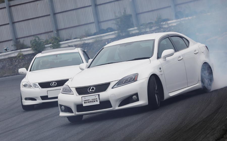 Next !? S15/JZX ドア数もMT車も選べる日産V6エンジン搭載車 V35/V36/V37スカイライン/Z33/Z34フェアレディZ ドレスアップセダンを横に向ければド迫力! 大柄ボディを持つレクサスGS350は、たとえ型遅れでも存在感&高級感は十分。V型 3.5リットルの2GR-FSEエンジンなら最高出力315PSを発揮するため、競技系ドリフトと はまた違う楽しさが味わえる。 400PSオーバーのレクサス「F」ならノーマルでもOK レクサスIS-F(USE20型)は、423PSというNAでも十分すぎるパワーを持つV型8気 筒5.0リットルの2UR-GSEを搭載。8速AT+パドルシフトでのドリフトは「まるでゲー ムのよう」とはオーナー談。 V36スカイラインはブーム到来の予感!? 比較的高年式で外観もイマっぽいV36スカイライン は、日産の後輪駆動車の中では数少ないMT搭載車。2 ドアも4ドアも選べるため、ドリフトを始める人にもい いチョイスと言える。 ただし…… スカイラインやフェアレディZはドリフトのキモとなるハンド ルの切れ角が少ない。しかし心配ご無用。海外製のいいパー ツが存在し、日本でも取り扱うショップが増えている。 Next !? S15/JZX レクサスでドリフトする歓び!? トヨタV6&V8エンジン搭載車 レクサスIS-F/GS350他 狙い目の日産後輪駆動は 高年式ZとV系スカイライン 前走は街乗り兼用ドリフト仕様のZ33 フェアレディZで、後追いが競技仕様の V35スカイライン。共にエンジンはノー マルのVQ35DEだが、写真の通りドリフ トは十分楽しめる。 57