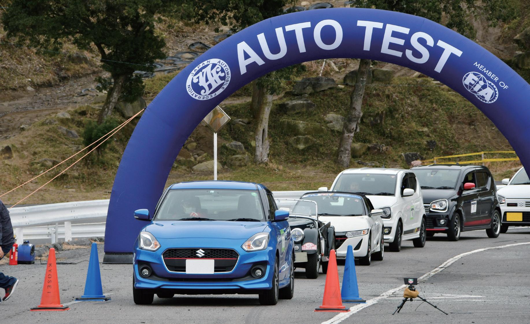 ら30〜40秒の間で走り切れるレイアウト になることが多い。開催できる場所がコン パクトだとコースレイアウトも限られてく るが、ある程度の広さを確保できる場合に は、長いスラロームや8の字ターンなどを 加えた設定とすることもある。 オートテスト導入から5年が経過し、リ ピーターも増えてきたことから、少し長め のコース設定を持つ大会も増えてきいる。 それでも基本的な運転技術で対応できるよ うになっているので、落ち着いて、ひとつ ひとつクリアしていけば、きっと最小減点 を得られるはずだ。 ステップアップに最適なオートテストのススメ “踏み切ったモン勝ち”はなし。ムダなく曲がって、止まった人が勝つ! ジムカーナ的なテクニカルセクションを設定したオートテストも開催中! 中国地区のジムカーナ& ダートトライアル選手の祭典、 JMRC中国フェスティバルは、 昨年も一般参加者を対象とし たオートテストを開催した。 スポーツランドTAMADA の広大な広場をフルに使っ たコースは、ほぼ直線がなく、 スラロームあり、180度ター ンありと、ジムカーナ的な楽 しさも味わえるテクニカルな 設定となった。車庫入れも、 横Gがかかる状態から進入 してバック、とライン取りも 問われた。西野洋平選手、小 俣洋平選手ら全日本選手も 参加して華麗な技を披露、 ちょっと背伸びしたオートテ ストを味わえるイベントと なった。 中部ジムカーナのメッカ のひとつ、キョウセイドライ バーランドで開催されたオー トテストは、「始めよう!モー タースポーツ」というテーマ のジムカーナ入門的な要素 を持ったイベントとなった。 一番の注目は、コース後半 に、オートテストでありなが ら、フリーターンを設定した こと!参加者達は思い思い のアプローチで楽しんでい た。コースが広かったことも あって、タイムアップのため にはライン取りも重要という 設定が採られた。パイロンの 間隔も広く、車格が大きなク ルマも取り回しがしやすいレ イアウトでもあった。 JMRC中国フェスティバル2019 開催日: 2019年12月8日(日) 主催 : FULL HOUSE 開催場所 : スポーツランドTAMADA (広島県広島市) オートテストinキョウセイ2020 開催日 : 2020年2月15日(土) 主催 : M-I 開催場所 : キョウセイドライバーランド (愛知県岡崎市) オートテストの特長 ・コースは200m×200m以内 ・最低1回はバックギヤを使用する設 定とする(最大で4回までOK) ・ハンドブレーキ(フットブレーキ含む) を使用せずに走れる設定とする ・フィニッシュライン後方に一時停止 ラインを設定する ・1台の車両での複数エントリーはOK ・同乗者は1名までOK 車庫入れ(BOX)をスムーズにこなせるかが上達へのポイント オートテストの設定でまずよくあるのが、「ラインまたぎ」。直線の途中で一旦停止を求められる場 合もあるが、車庫入れのために方向転換を促すものとして設定されるケースが多い。この場合、車庫 入れを焦るあまりにギヤが入りきらない内に発進してしまうのはよくあるミス。落ち着いて操作した い。上級者となると、次の車庫入れがやりやすい角度でラインをまたぐという技も使われる。