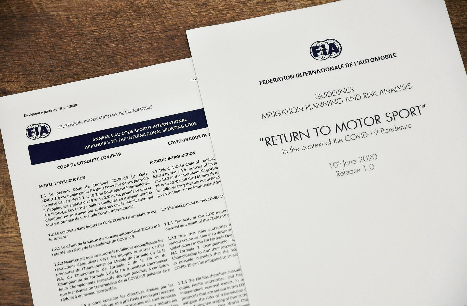 F2、F3のチームとステークホルダーの求めにより制限 の緩和を行い、チャンピオンシップの再開を……」とい う一文が記述され、トップフォーミュラ以外の世界選 手権、スポーツカーやツーリングカー、そしてラリー やラリーレイド等への言及はなかった。 FIAは、7月上旬のF1再開に合わせたタイミングでガ イドラインや行動規範を発行した。そして「FIA GUIDELINES MITIGATION PLANNING AND